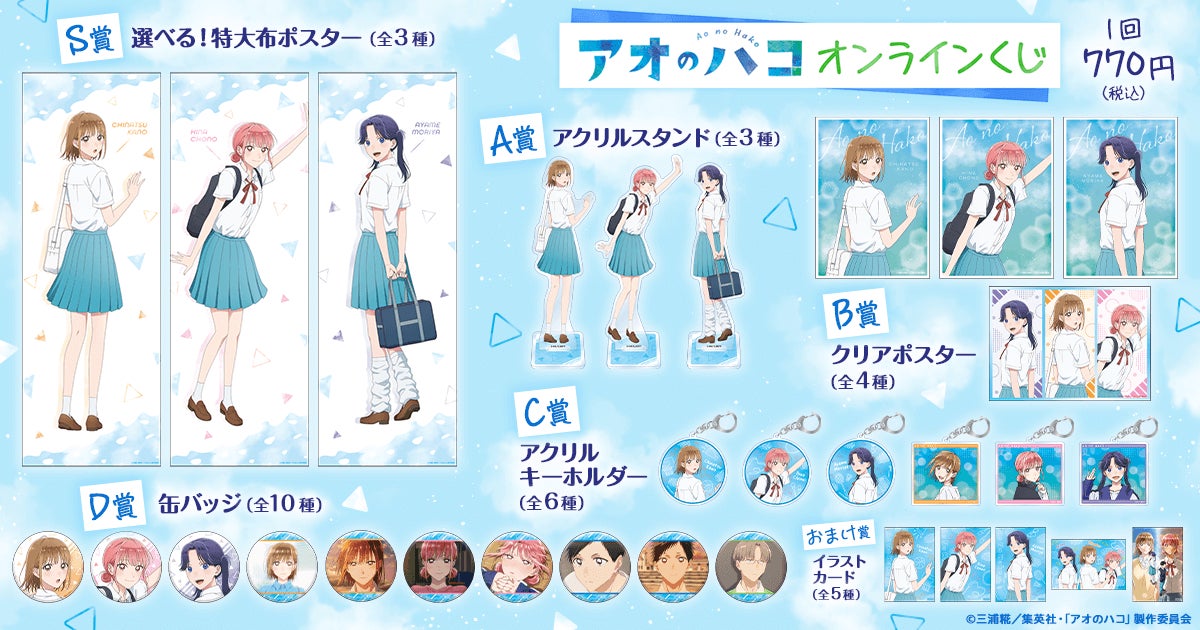 株式会社KADOKAWA(本社:東京都千代田区、取締役 代表執行役社長 CEO:夏野 剛、以下 KADOKAWA)は、運営するオンラインくじサービス「くじ引き堂」において、『アオのハコ』の豪華賞品が手に入る<アオのハコ オンラインくじ>を、2025年4月10日(木)12時より販売します。