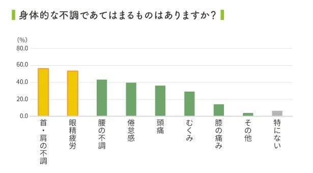 お疲れを感じる箇所で多かった回答は「首・肩の不調(55.9%)」や「眼精疲労(53.1%)」が挙がりました。スマホやパソコンなどの長時間使用が原因の1つにあると推察されますが、それらをキリの良いところでサッと辞めることは至難の業。不調の原因にならない程度に楽しみたいものです。