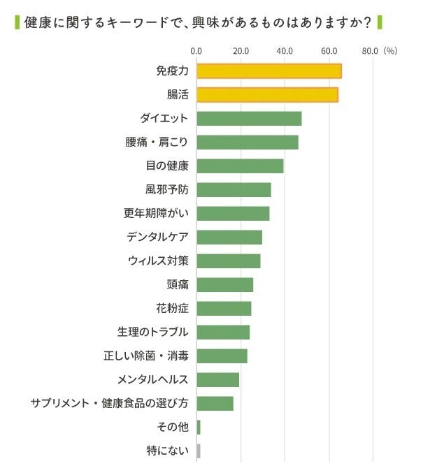 「免疫力(65.5%)」や「腸活(64.1%)」が上位に入る結果に。スーパーでも「腸活」や「免疫力アップ」を謳う商品を目にしますよね。発酵食品を取り入れてみるなど、日々の暮らしの中で手軽に始められるのが嬉しいところでもあります。