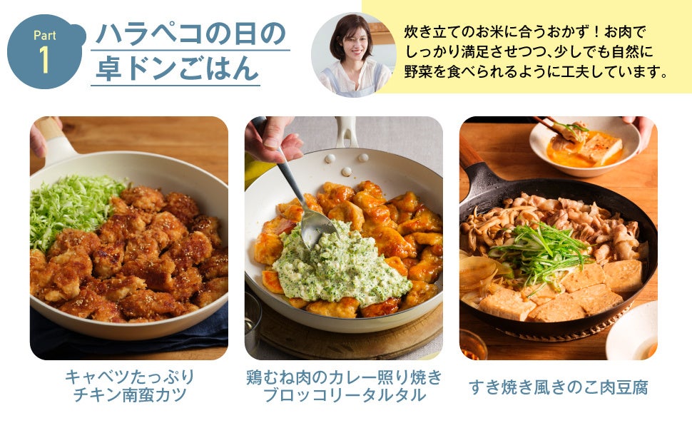 著者4冊目となる最新作は、3人目の子どもが生まれて、ますます限界育児に挑戦中の日々に考案された「フライパンごとドンと出せば、みんなが笑顔になる料理」。大人はもちろん子どもでも食べやすく、手に入りやすい食材で、一品だけでも彩りよく、少しでも栄養が摂れるようにと考えられたメニュー。取り分ける作業もおかわりも自由。家族の会話もはずみます!