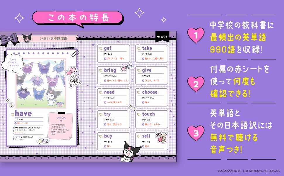 『クロミと中学英単語』は教科書最頻出の英単語990語を厳選。『シナモロールと中学英語』と『ポチャッコと中学数学』も教科書で最も大事な要点だけにしぼっているので、コスパよく学習することができます。