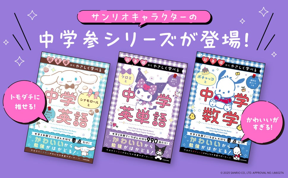 株式会社KADOKAWA(本社:東京都千代田区、取締役 代表執行役社長 CEO:夏野剛)は、『超基礎からやさしく学べる クロミと中学英単語』『超基礎からやさしく学べる シナモロールと中学英語』『超基礎からやさしく学べる ポチャッコと中学数学』(各監修:京進)を2025年5月2日(金)より発売開始しました。