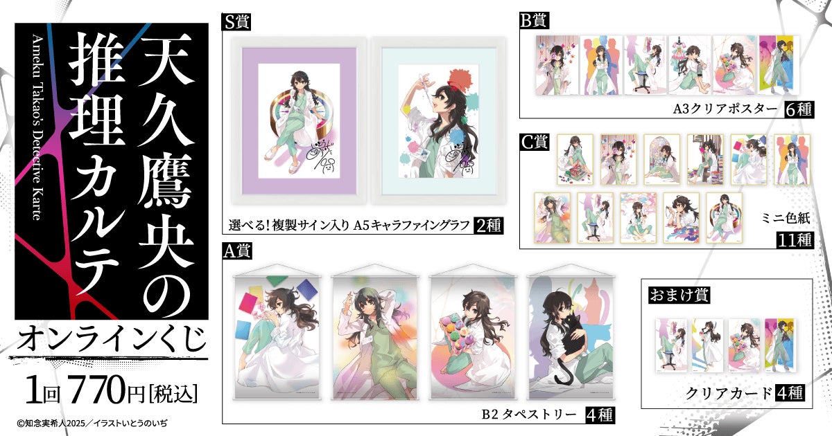 株式会社KADOKAWA(本社:東京都千代田区、取締役 代表執行役社長 CEO:夏野 剛、以下 KADOKAWA)は、運営するオンラインくじサービス「くじ引き堂」において、『天久鷹央の推理カルテ』の原作イラストを使用した豪華賞品が手に入る<『天久鷹央の推理カルテ』オンラインくじ>を、2025年5月8日(木)17時より販売します。
