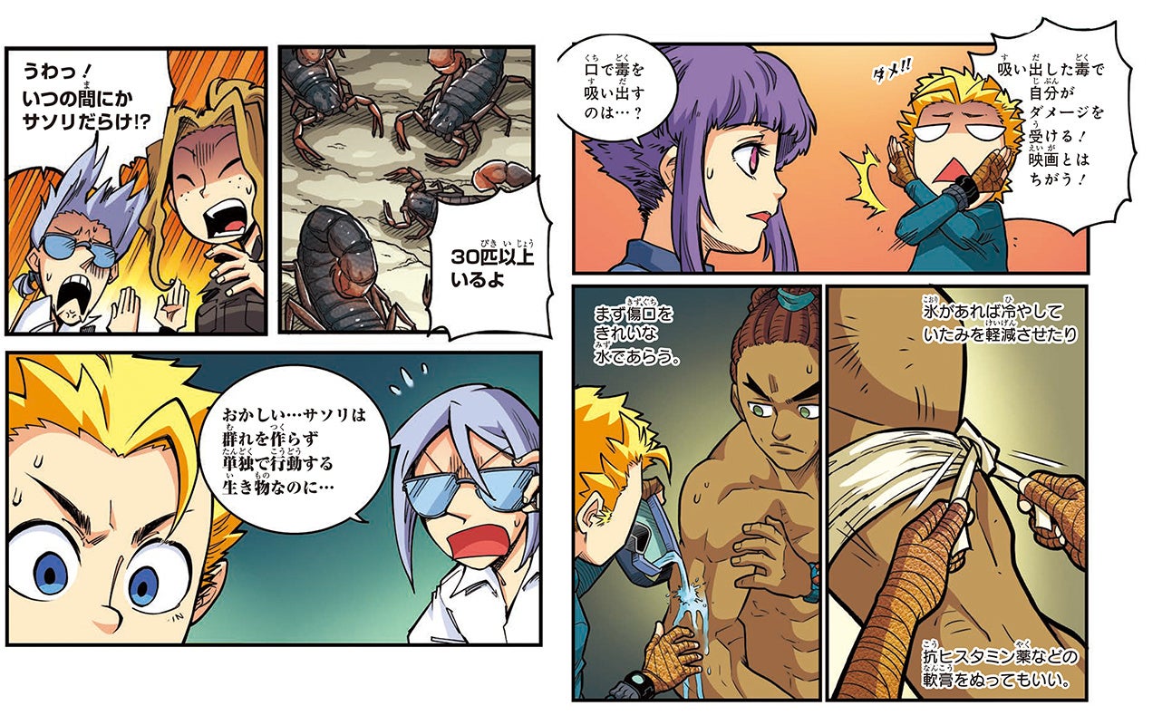 迫力満点のまんがには、サソリの生態や生きのびるための知識が随所にちりばめられています。