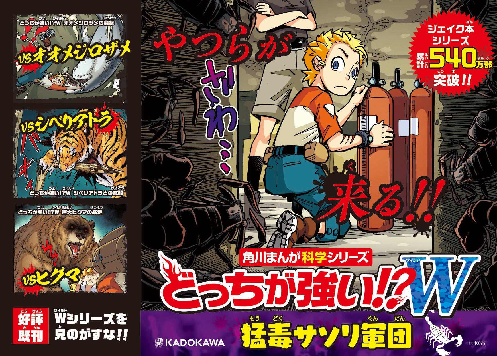 株式会社KADOKAWA(本社:東京都千代田区、取締役 代表執行役社長 CEO:夏野剛)は、角川まんが科学シリーズ『どっちが強い!?W 猛毒サソリ軍団』(監修:吉田勝次・丸山宗利、ストーリー:タダタダ、まんが:マウンテントップスタジオ)を2025年4月23日(水)に刊行しました。大自然とともに生きるための「サバイバル技術・生き物の生態・自然環境」を、まんがで楽しみながら理解できる話題のシリーズに4冊目が登場です。