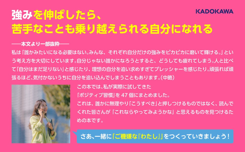 株式会社KADOKAWA(本社:東京都千代田区、取締役 代表執行役社長 CEO:夏野剛)は、2025年5月7日(水)に『毎日ご機嫌な「わたし」をつくる47のポジティブ習慣』(著:中山晴菜)を発売いたします。