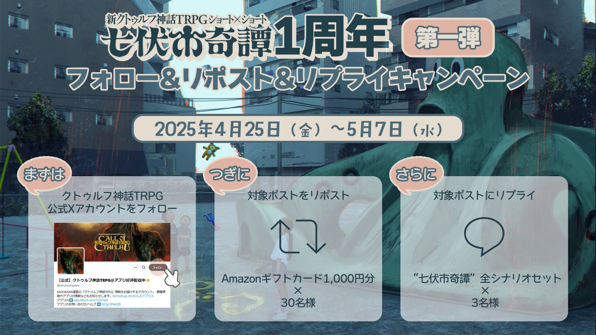 株式会社KADOKAWA(本社:東京都千代田区、 代表取締役社長:夏野剛)が刊行中の"新クトゥルフ神話TRPG”人気シナリオシリーズ、"七伏市奇譚”が、2025年4月25日(金)に1周年を迎えます。1周年を記念して、第一弾として関連シナリオのセール販売や、豪華景品が当たるキャンペーンを開催いたします。
