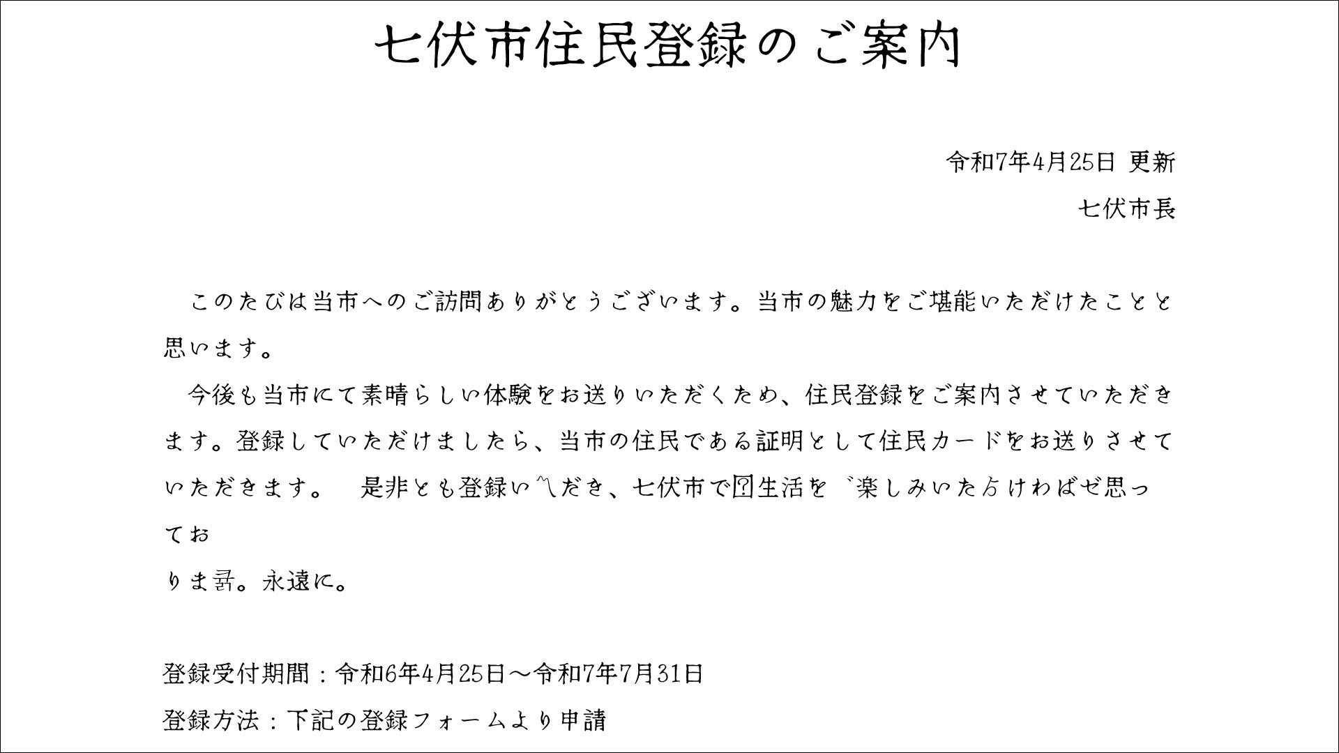 2025年4月30日(水)をもって終了を予定しておりました七伏市住民登録ですが、ご好評につき1周年を記念して期間を延長いたします。