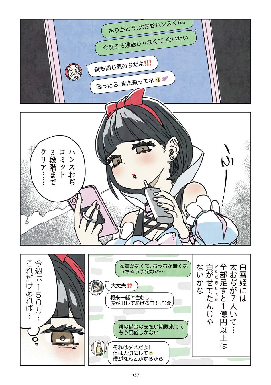マッチングアプリで生計を立てる“マッチ売りの少女”や、貢がせたお金でホストに通う“白雪姫”、ラウンジ嬢として港区で成り上がりを目指す“シンデレラ”など…。令和のいまだからこそ生じる、時流を捉えた話題を“現代版おとぎ話”にしてお届けします。