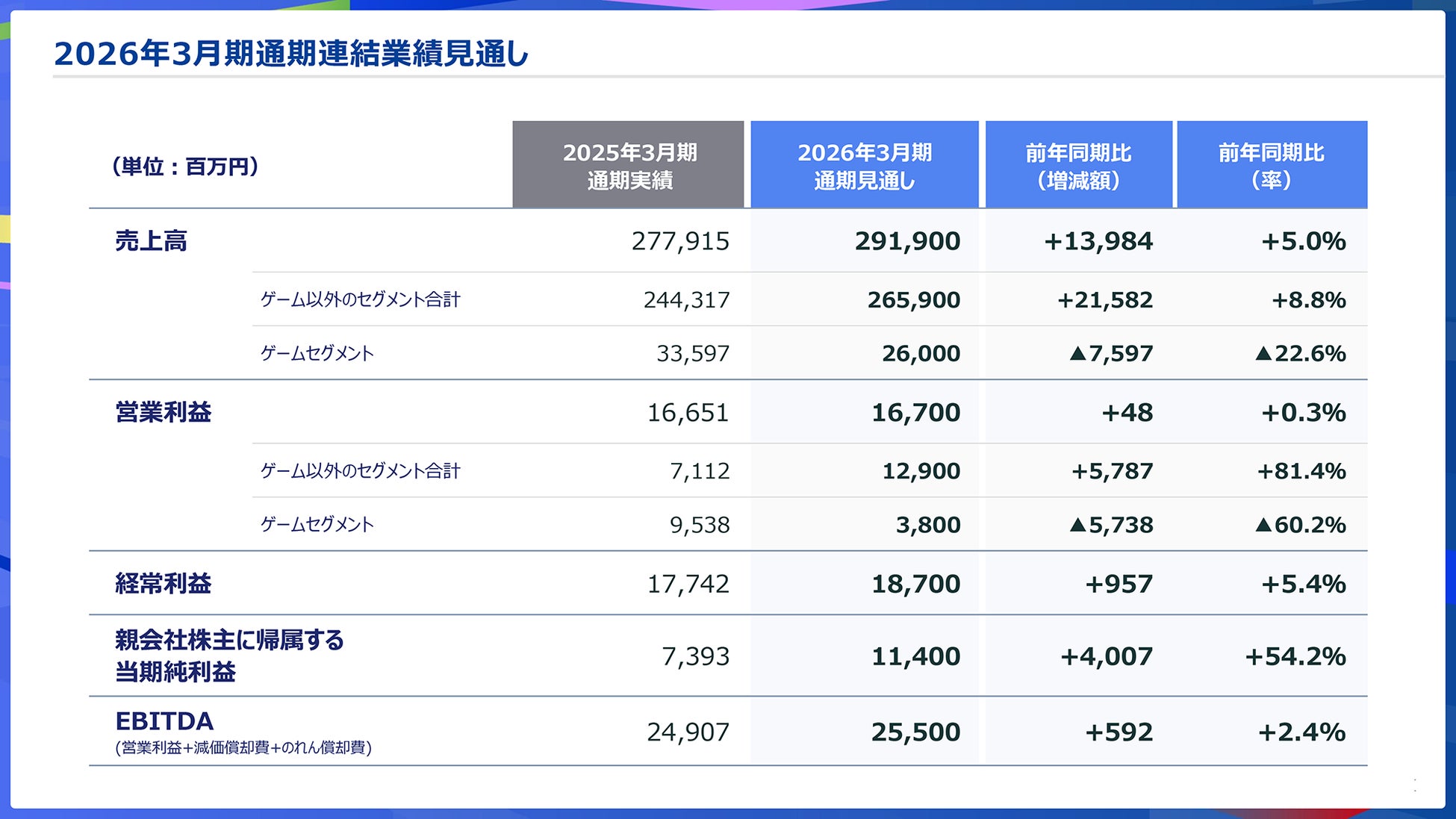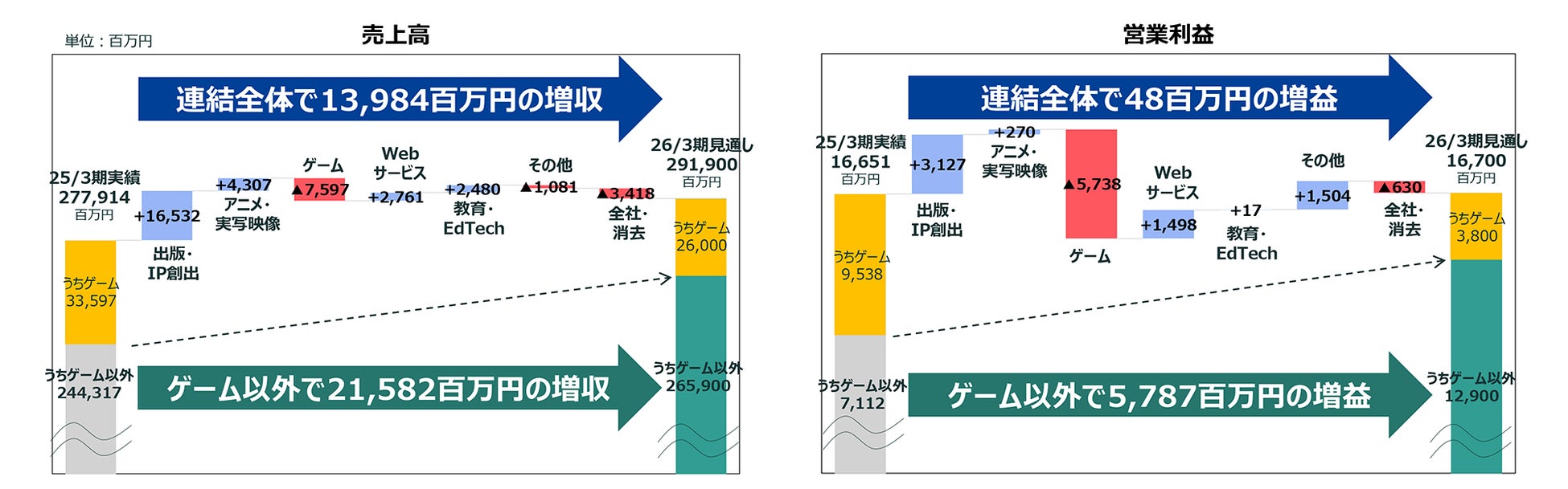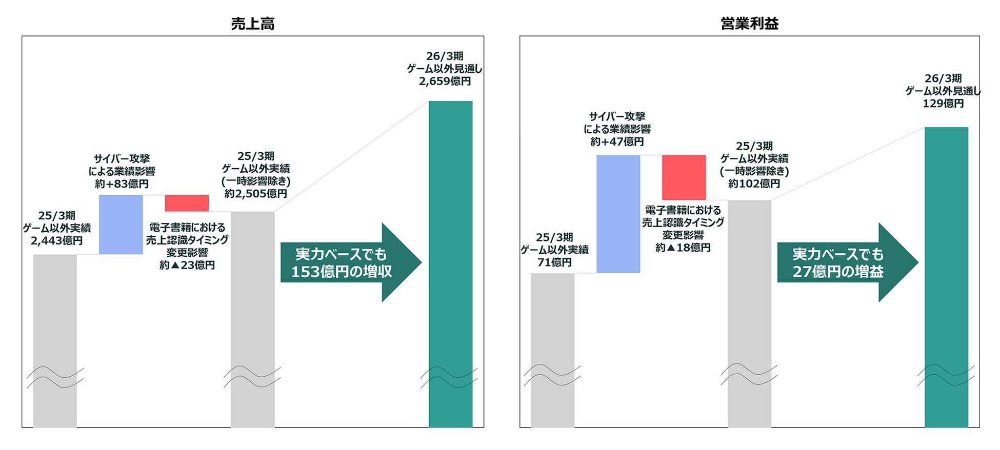 ゲーム以外の事業の合計では、2025年3月期のサイバー攻撃影響(マイナス影響)、電子書籍における売上認識タイミング変更影響(プラス影響)といった一時的要因を除外した実力ベースで見ても、堅調な増収増益を達成見込み