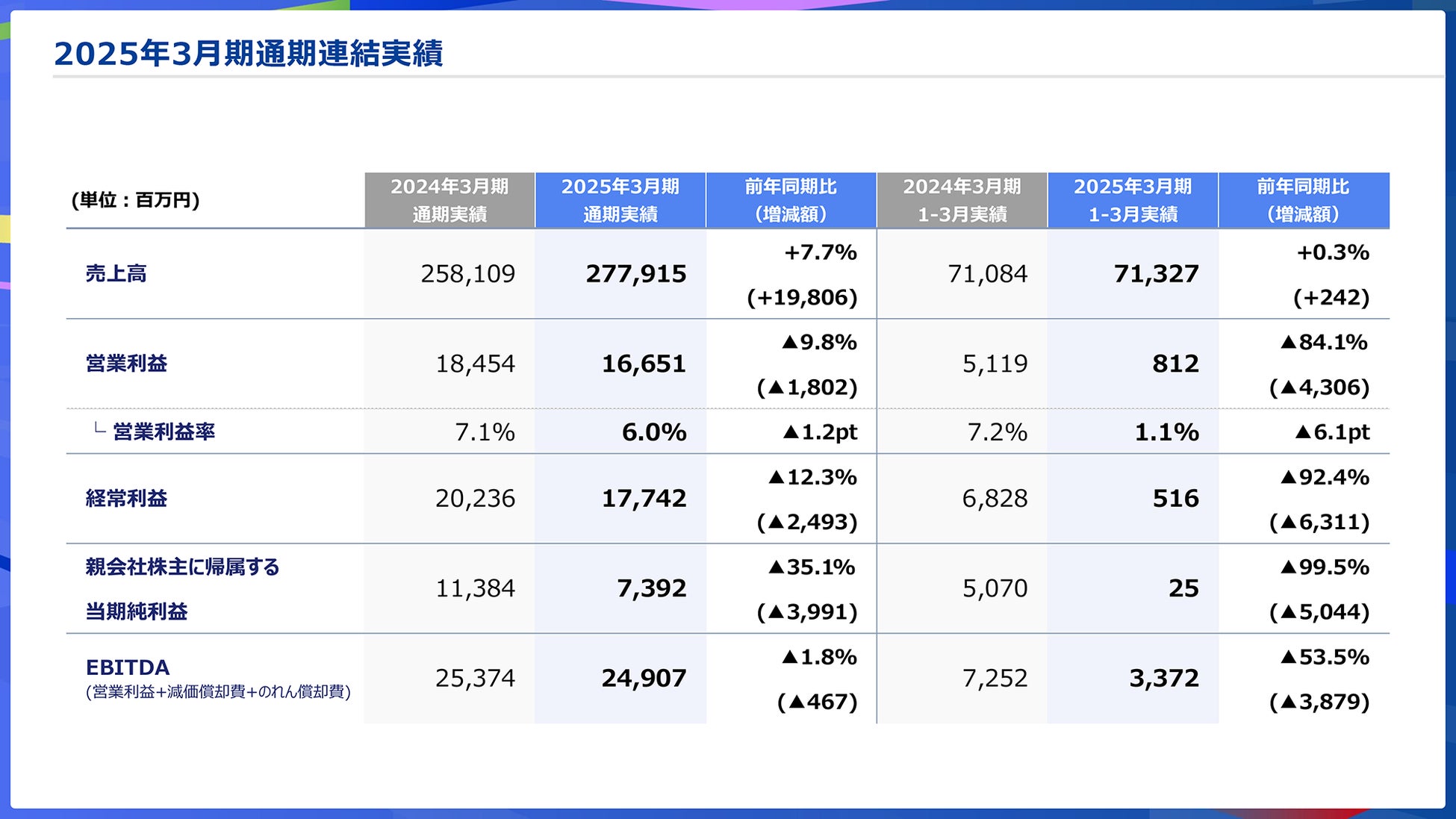2025年3月期通期連結実績では、サイバー攻撃の影響が大きく発生するも、成長領域の伸長により売上高は増収。営業利益は減益も、期初および直近の業績予想を上回る。