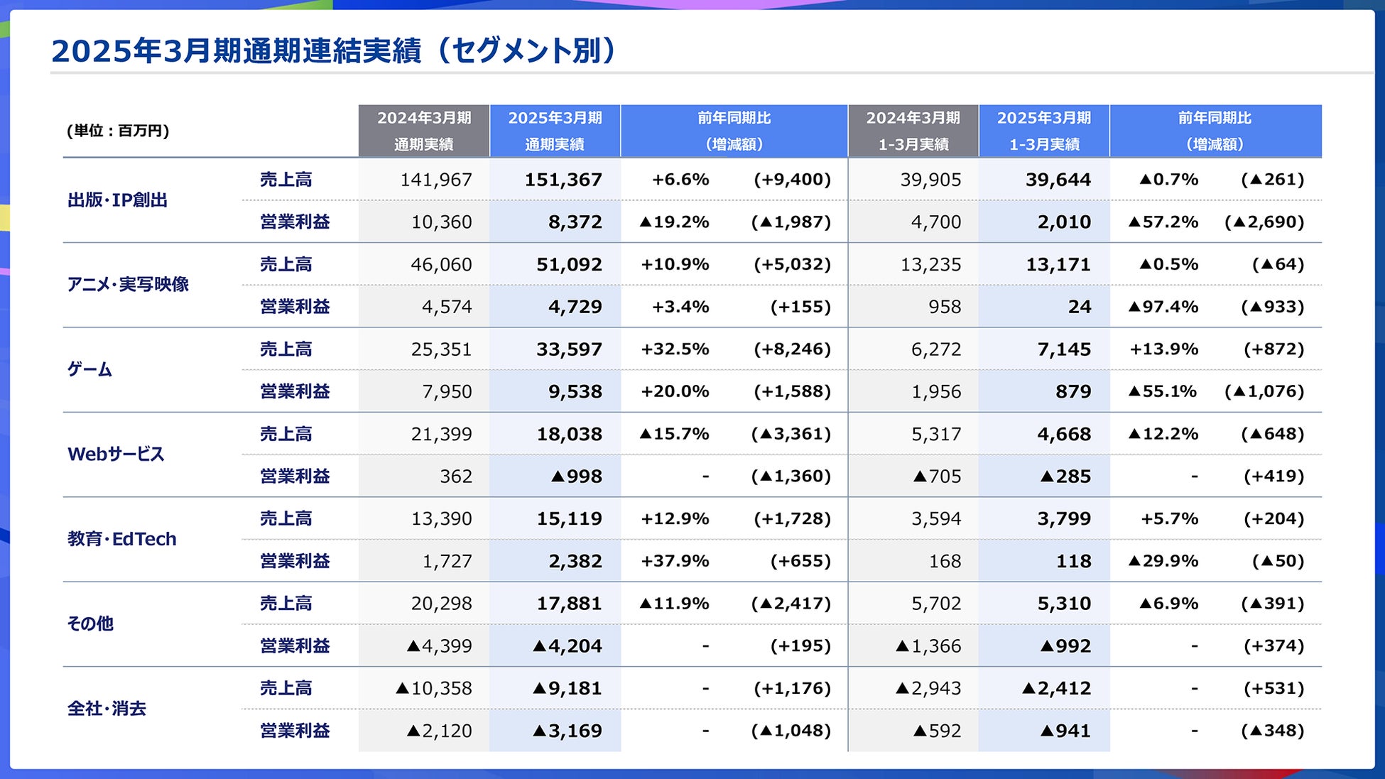 株式会社KADOKAWA(本社:東京都千代田区、取締役 代表執行役社長 CEO:夏野剛、東証プライム:9468)は、2025年5月8日、2025年3月期 通期決算を公表いたしました。