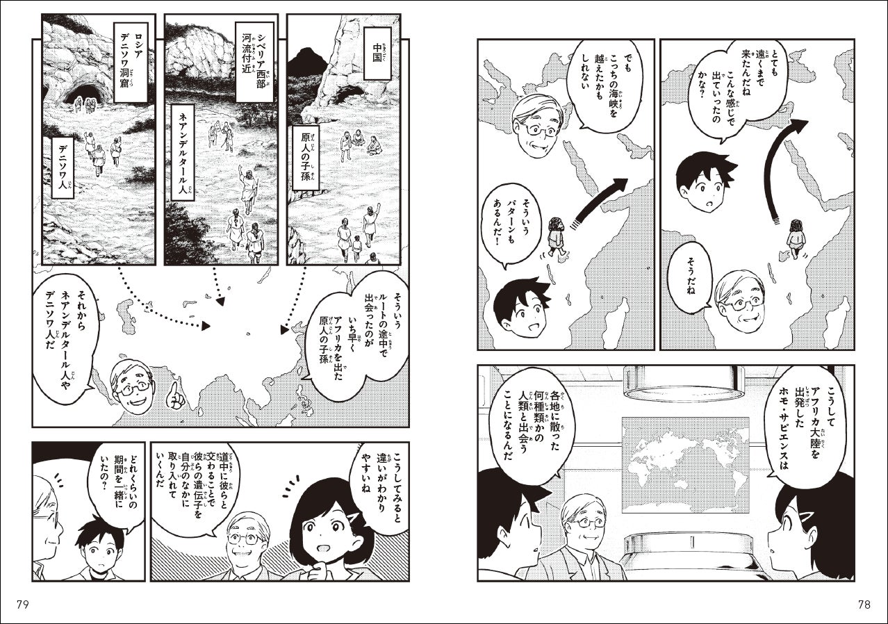 そんな人類の生活の実態や進化の歴史を、DNAやゲノムといった生物学的調査で得られた科学的データで解き明かし、マンガでわかりやすく解説。そしてそれぞれの項目を一対一で視覚的に図解しているので、人類史の移り変わりのストーリーも学べます。