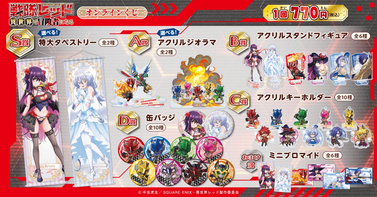 株式会社KADOKAWA(本社:東京都千代田区、取締役 代表執行役社長 CEO:夏野 剛、以下 KADOKAWA)は、運営するオンラインくじサービス「くじ引き堂」において、TVアニメ「戦隊レッド異世界で冒険者になる」の豪華賞品が手に入る<TVアニメ『戦隊レッド 異世界で冒険者になる』オンラインくじ>を、2025年6月3日(火)12時より販売します。