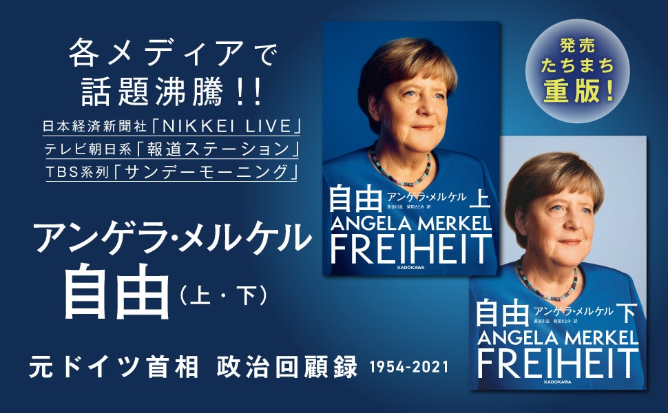 『自由』は5月28日にKADOKAWAから発売され、メルケル氏もプロモーションのため来日。「NIKKEI LIVE」日本経済新聞社、「報道ステーション」テレビ朝日系、TBS系列「サンデーモーニング」などで紹介され、多くの書店でbookランキング1位、2位を獲得し話題となっています(※)。対立が激化する時代において、本書は、東ドイツで子供時代を過ごしたメルケル氏の「自由」への重要な意思表明です。ぜひご注目ください。