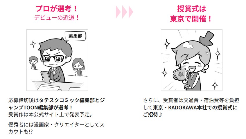 応募作品の選考はKADOKAWA タテスクコミック編集部・集英社 ジャンプTOON編集部が協力して行います。