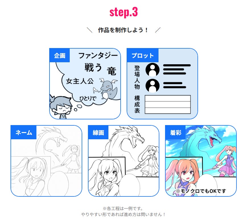 縦スクロールコミックは、工程ごとに手分けして作業をすることがあるのも特徴の一つ。シナリオ・線画・着彩など、あなたが得意なパートを活かして参加できます!