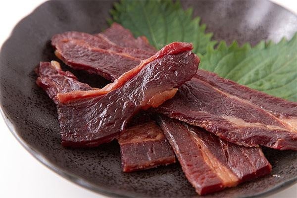 噛めば噛むほど口いっぱいに旨味が広がる!甘辛にんにく醤油味の国産馬刺し風ジャーキー。