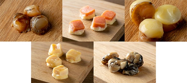 北海道産ほたて、焼き帆立チーズ添え、鮭チーズ添え、焼きいかチーズ添え、北の燻製つぶ貝