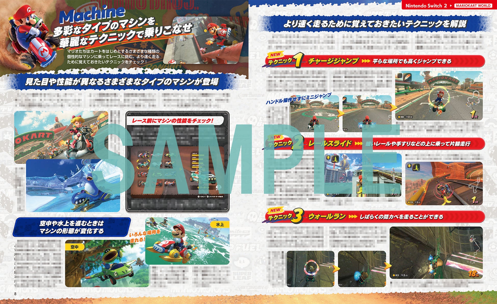 また「マシン」のコーナーでは、マリオたちが乗るマシンの概要と、新しいドライブテクニック"チャージジャンプ"、"レールスライド"、"ウォールラン"、そしてシリーズおなじみの"ロケットスタート"や"ジャンプアクション"など、より速く走るための8つのテクニックをお見せします。