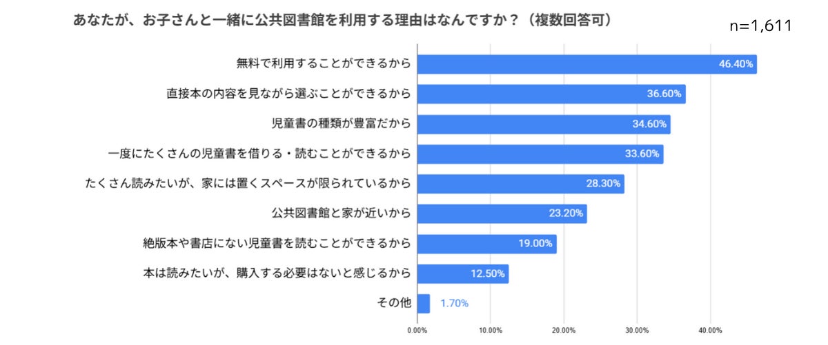 また、「図書館という空間が好きなので。司書さんとお話ししたり、子どもの成長を感じたりできる」「子どもが図書館の雰囲気が好きだから」といったコメントもあり、純粋に図書館という空間を楽しんでいる方もいらっしゃいました。