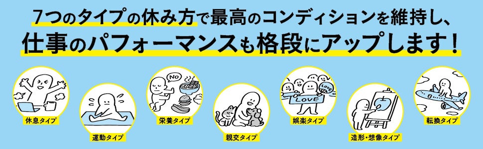 現代社会の疲れにはさまざまな要因があり、フィジカルなものだけでなく、メンタルも関係しているそうです。それらの要因を「ストレッサー」と呼び、どうして疲労につながるのかを解説しています。また、休み方には7つのタイプがあり、実は寝るだけでなく、運動をしたり、趣味に力を入れたり、友だちに会ったりなど、「攻めの休養」が重要とのことです。休み方にも選択肢があるため、自分に合った休み方を見つけられるようになっています。