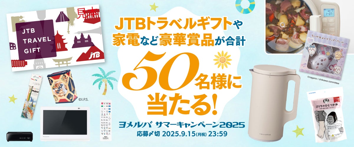 株式会社KADOKAWA(本社:東京都千代田区、取締役 代表執行役社長 CEO:夏野剛)は、児童書サイト「ヨメルバ」にて、JTBトラベルギフトや育児の束の間にほっと一息つける家電などの豪華賞品が50名様に当たるサマーキャンペーンを2025年7月11日(金)より開始しました。