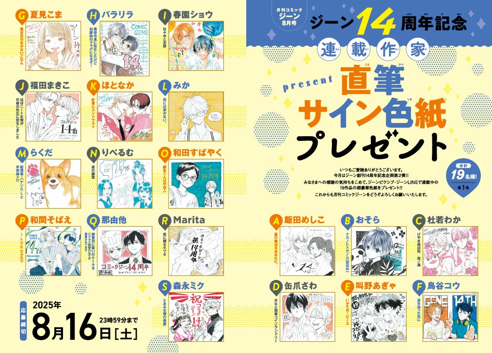 ジーン創刊14周年記念企画第2弾として、ジーンピクシブ・ジーンLINEの連載作家陣の豪華サイン入り色紙をプレゼント!!
