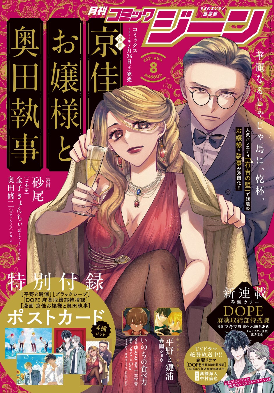 月刊コミックジーン8月号が2025年7月15日(火)に発売! 表紙は『漫画 京佳お嬢様と奥田執事』、裏表紙には新連載の『DOPE 麻薬取締部特捜課』が登場!