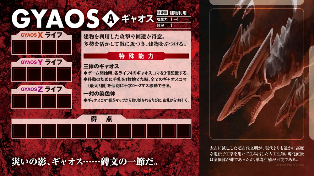 プレイヤーが選べる怪獣は「ガメラ」、「ギャオス」、「レギオン」、「イリス」の4種類。それぞれの怪獣ごとに映画で見られる特徴を活かして行動できるように、ゲームルールへ反映されています。