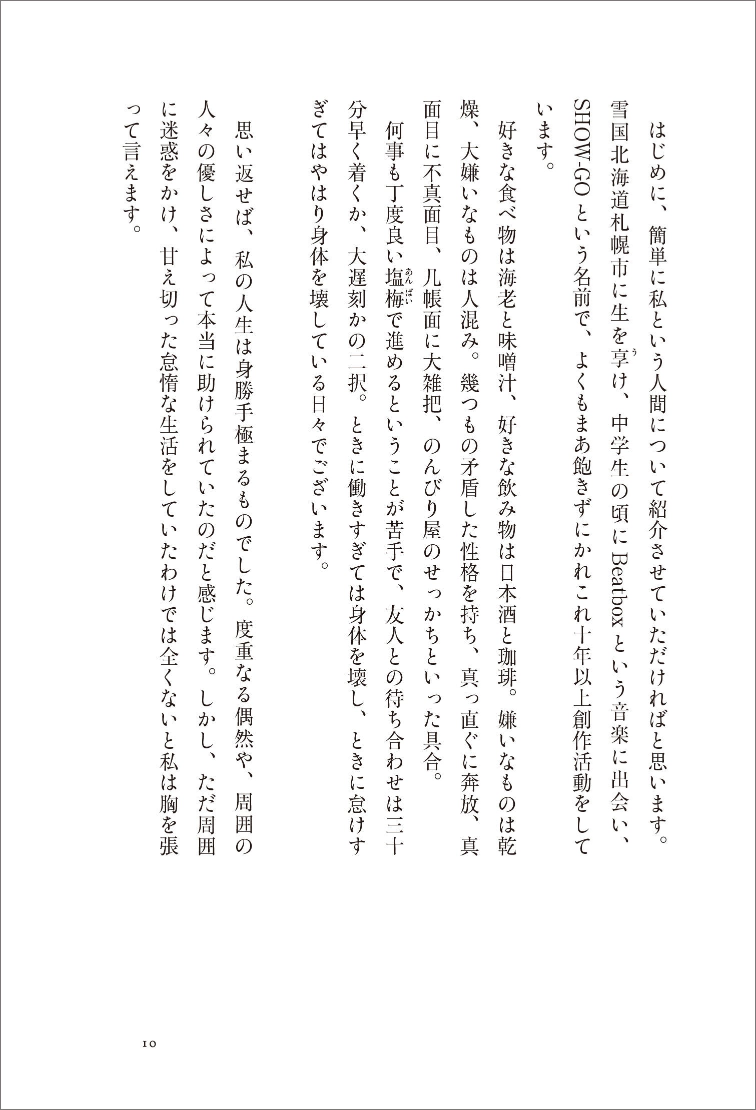 そんなSHOW-GOのビートボックスを始めたきっかけ、学生時代の反抗期の話、家族、京都の話、セルフプロデュース論など、京都在住、和を以て貴しとなす独自のスタイルを持つ彼の素顔に迫ったオール本人書き下ろしの1冊。