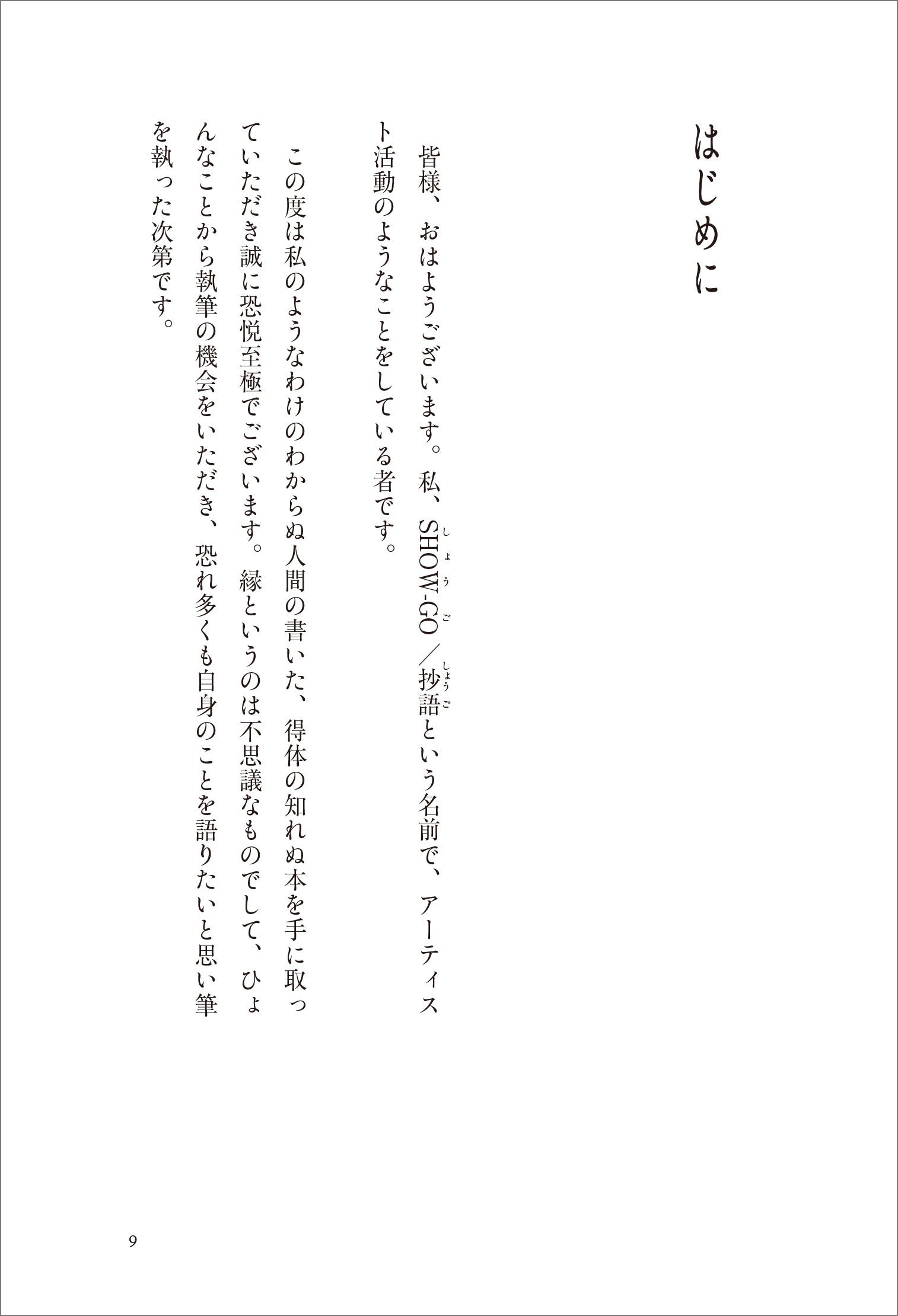 この度は私のようなわけのわからぬ人間の書いた、得体の知れぬ本を手に取っていただき誠に恐悦至極でございます。縁というのは不思議なものでして、ひょんなことから執筆の機会をいただき、恐れ多くも自身のことを語りたいと思い筆を執った次第です。