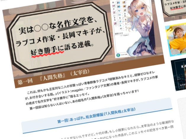 「経験済みなキミと、経験ゼロなオレが、お付き合いする話。」著者として知られる長岡マキ子先生による、日本文学紹介エッセイ。ラノベ作家としての、ラブコメ作家としての目線で名作文学を紐解いていきます。「えっこんな解釈もできるのか⁉」一読の価値高いコーナーです。