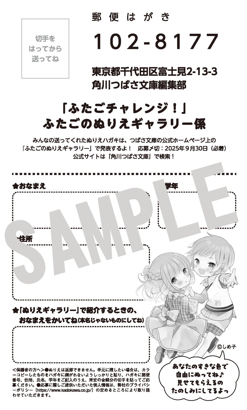 さらに、塗り終わった作品に85円切手を貼り、必要事項を記入して編集部に送ると、2025年10月中旬より角川つばさ文庫公式サイトで公開される「ふたごぬりえギャラリー」に掲載されます。