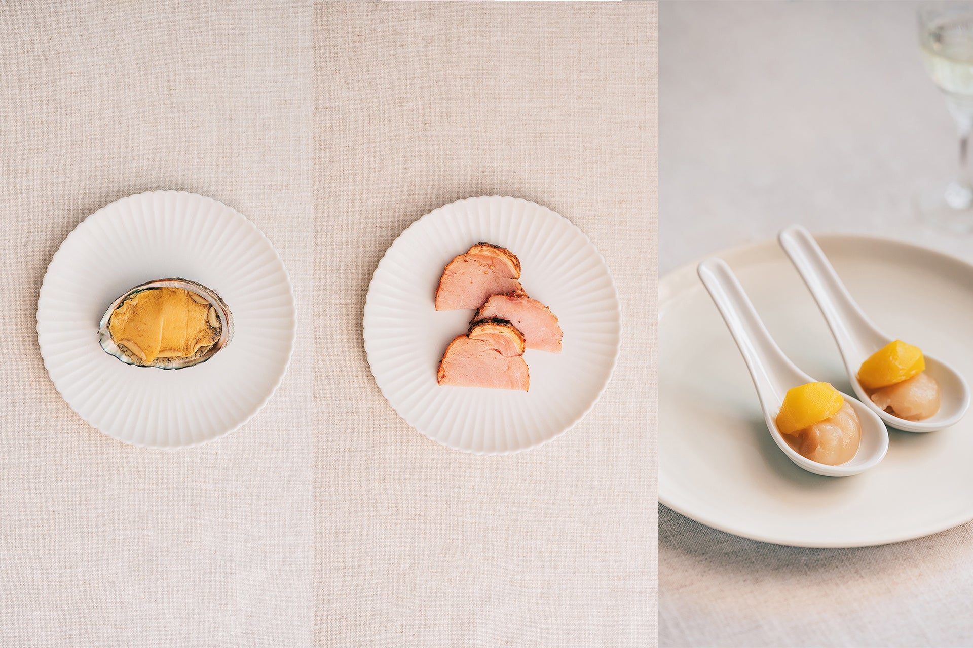 黒糖ローストポーク(写真中央)、あわび汐蒸し(左)、リンゴきんとんと栗甘露煮(右)