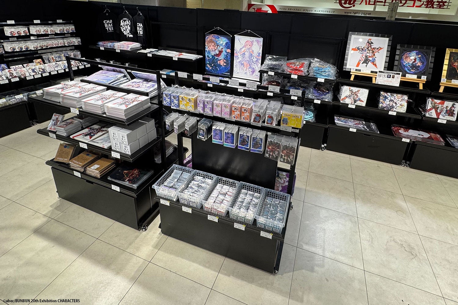 物販会場では、展覧会オリジナルグッズを多数販売中。また、描き下ろしイラストを使用したキャラファイングラフの受注販売も行っています。