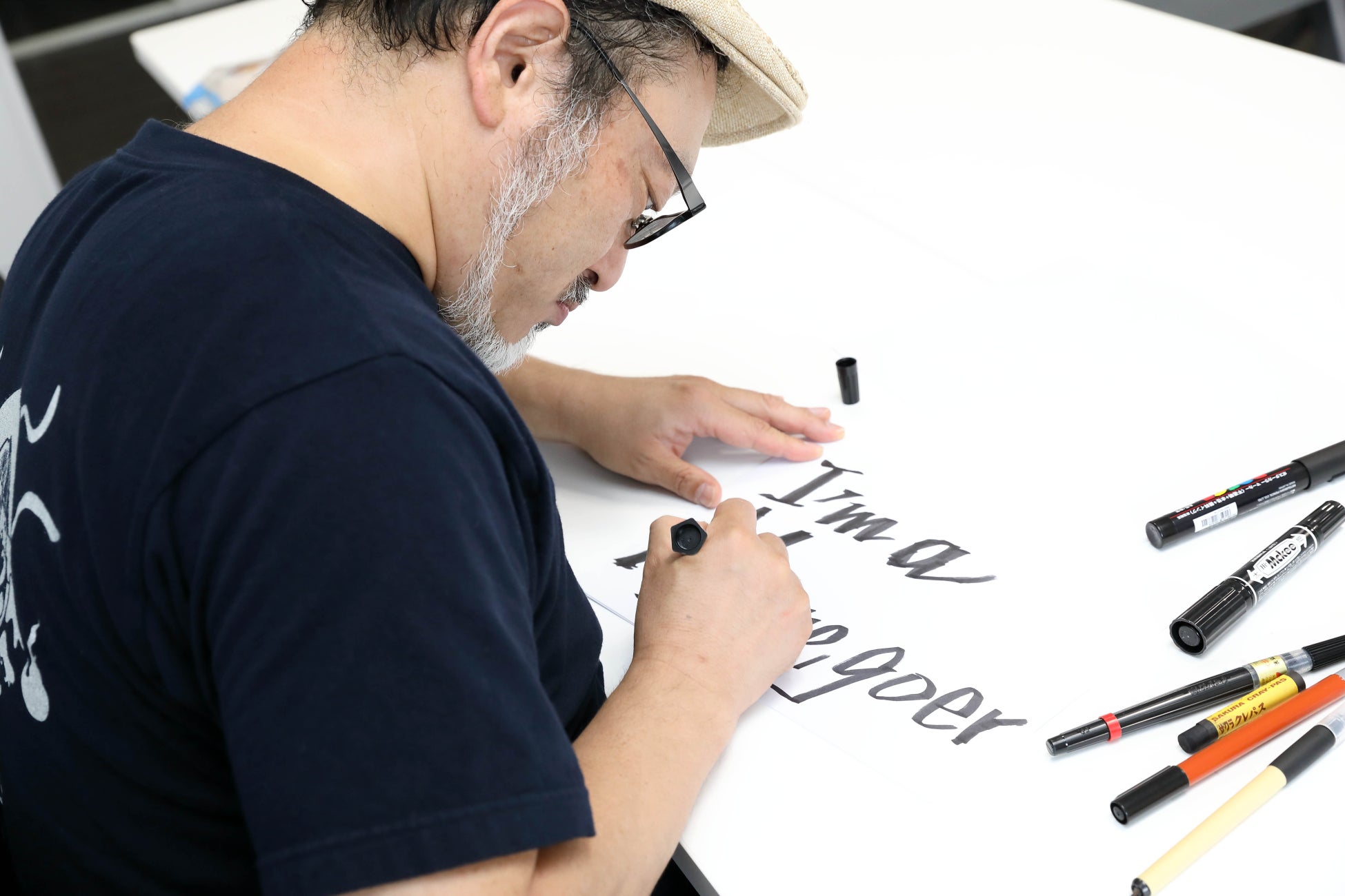 直筆メッセージをクレヨンで書き下ろした白石監督。納得いくまで何度も重ね塗りをして、ホラー映画のタイトルを思わせるデザインの「I’m a Moviegoer」メッセージが完成しました!