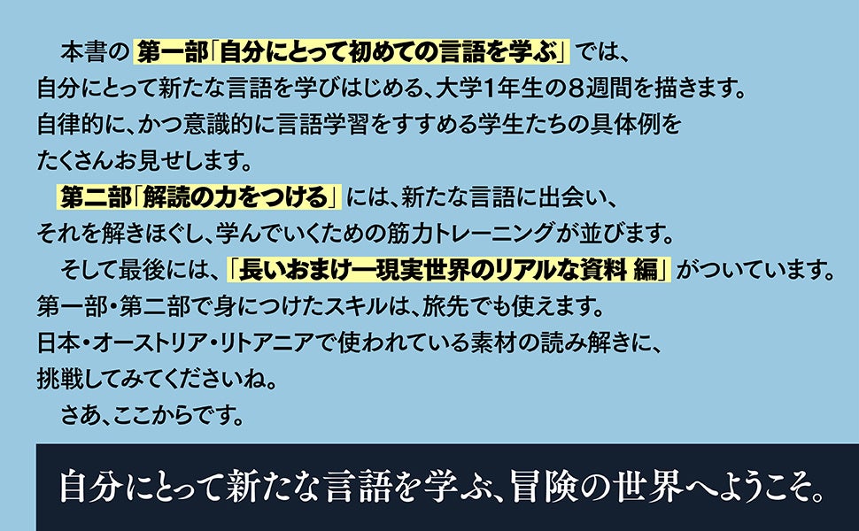 本書は、著者が実際に大学で行っている「8週間の授業」をテーマにしています。ギリシャ語、スワヒリ語、韓国語、フランス語など、学生たちが見知らぬ言語に立ち向かう8週間を追体験することで無理なく「語学学習のヒント」を得られます。