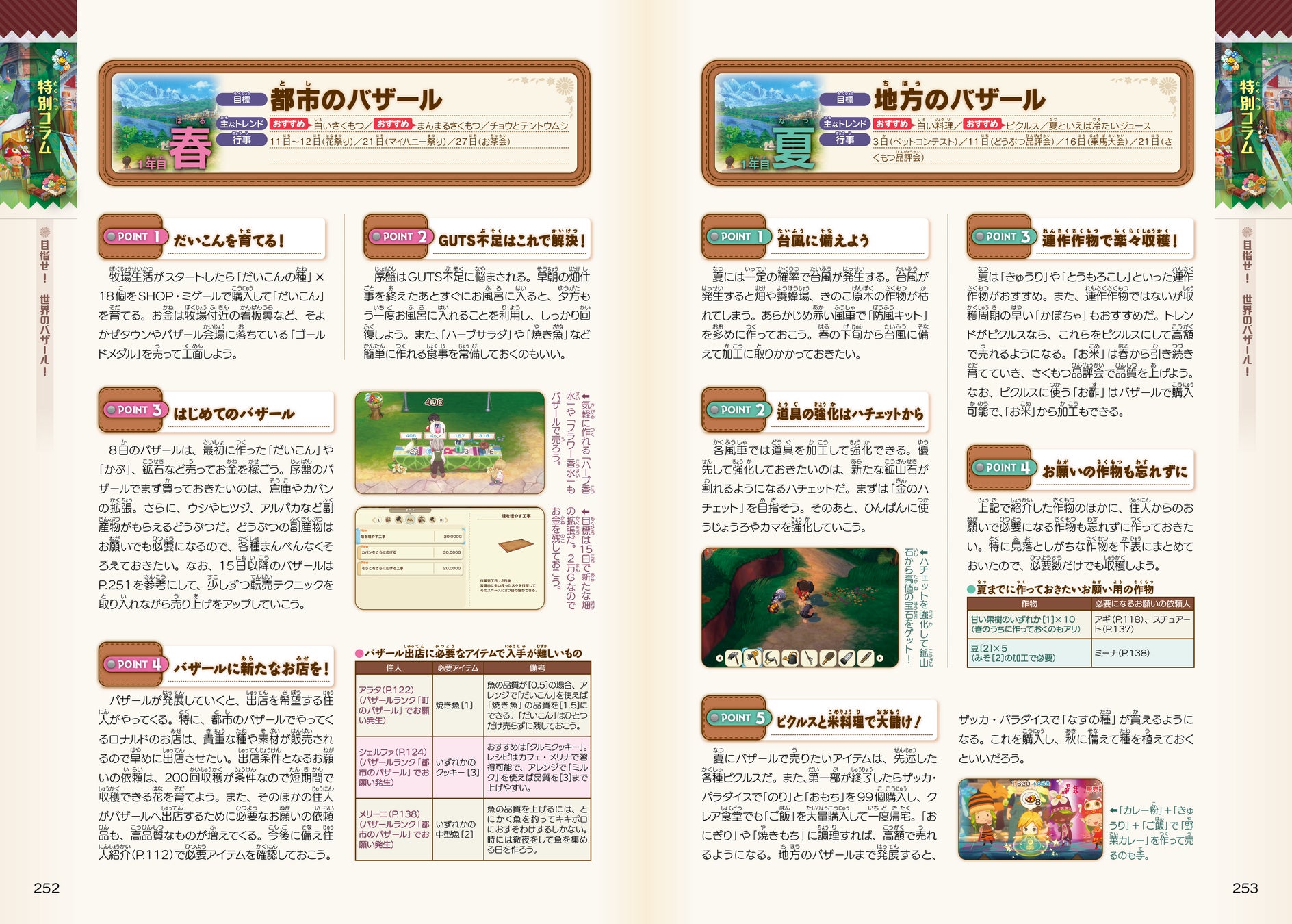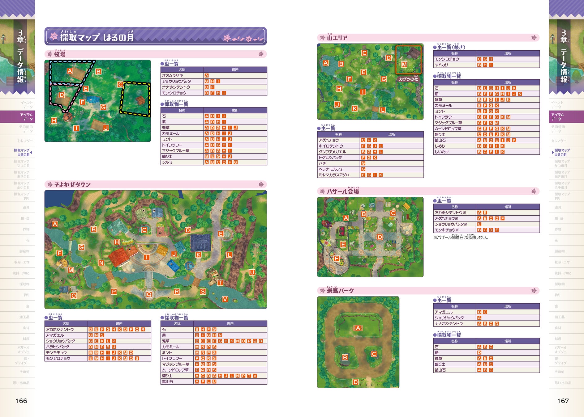 道具や作物、料理やペットなどの膨大なデータを収録。虫や魚の採取用に季節別のマップを掲載するなど、ボリュームだけでなく使いやすさと実用性を兼ね備えたコーナーです。