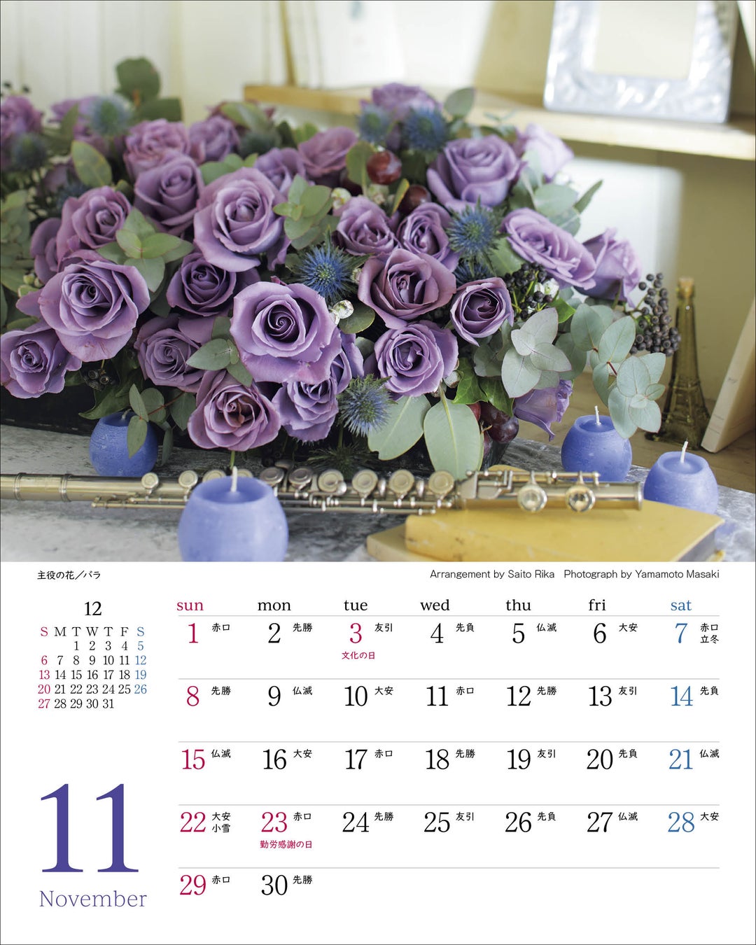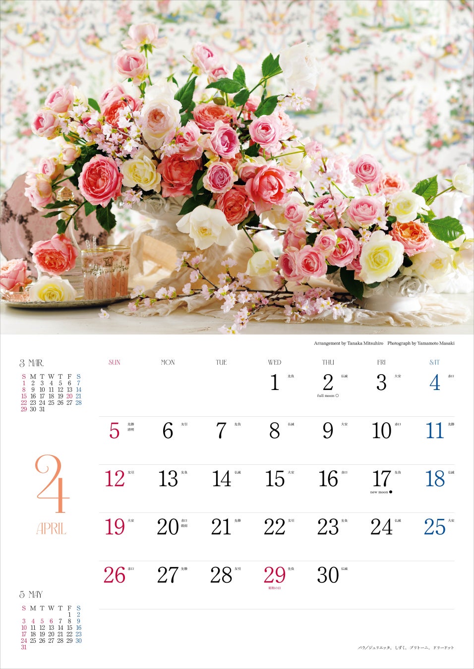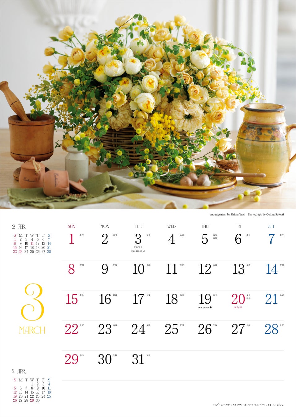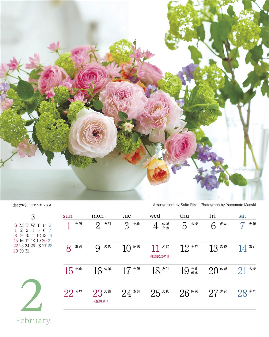 コチョウラン、ラナンキュラス、ミモザ、サクラ、シャクヤク、アジサイ……と、その月にもっとも美しい花のアレンジで、季節を綴ります。ビジュアルはもちろん、機能も充実したカレンダーです。