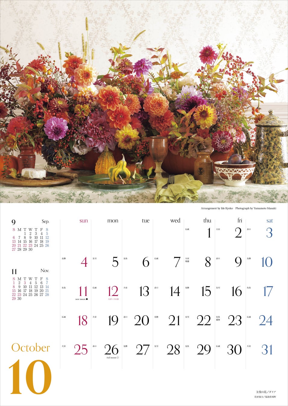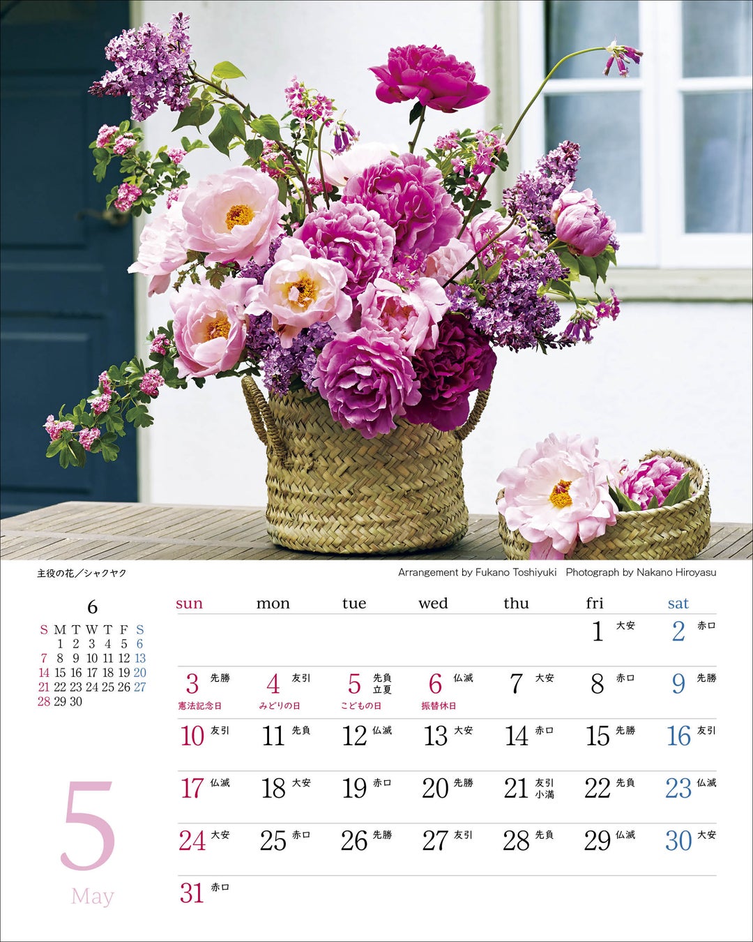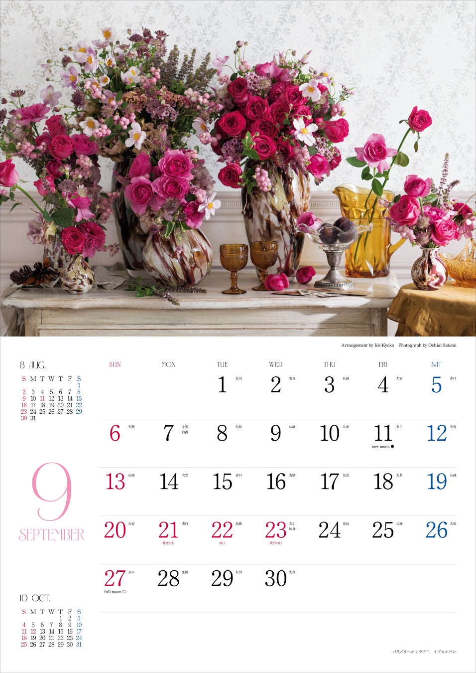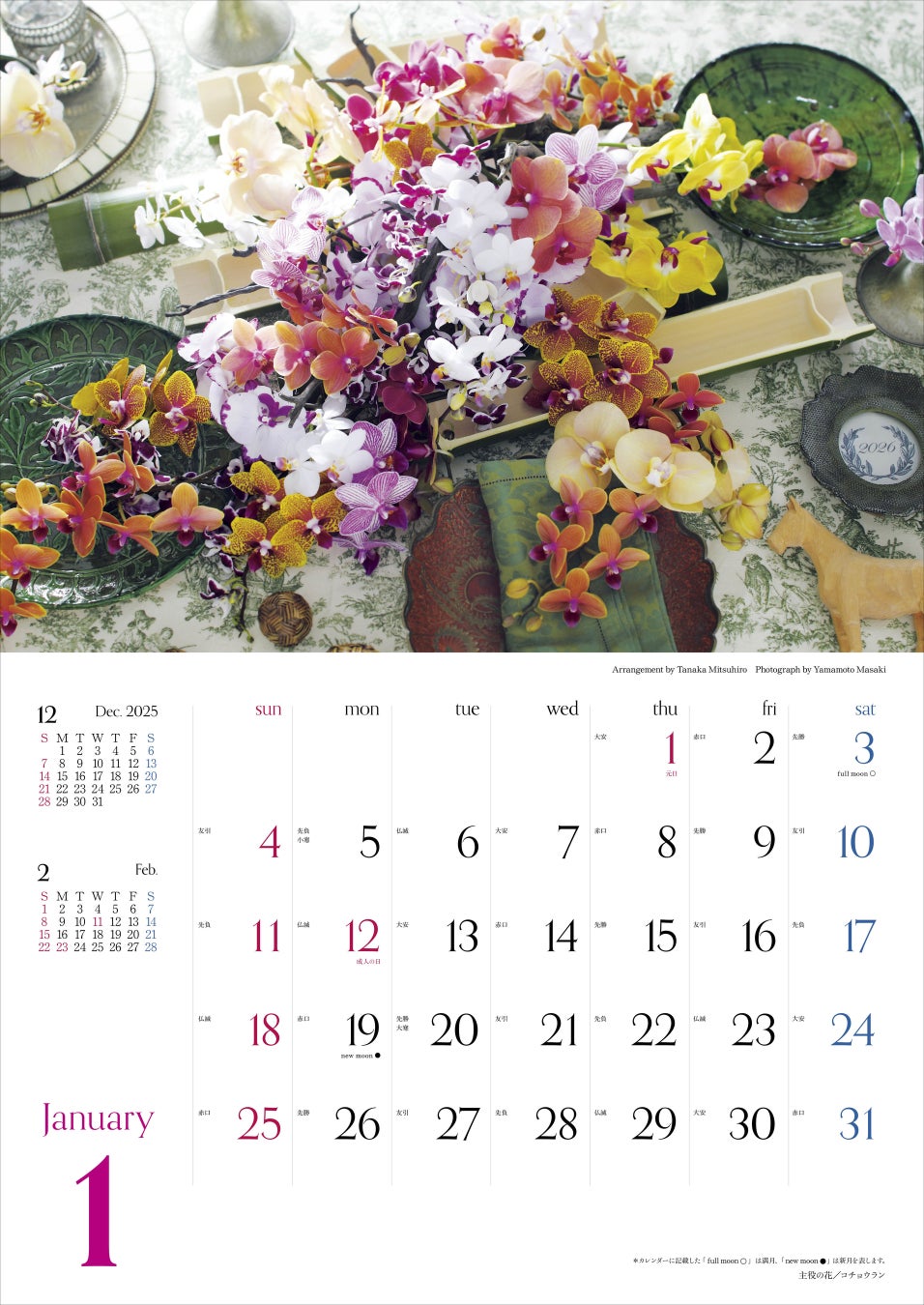 コチョウラン、ラナンキュラス、ミモザ、サクラ、シャクヤク、アジサイ……と、その月にもっとも美しい花のアレンジで、季節を綴ります。ビジュアルはもちろん、機能も充実したカレンダーです。