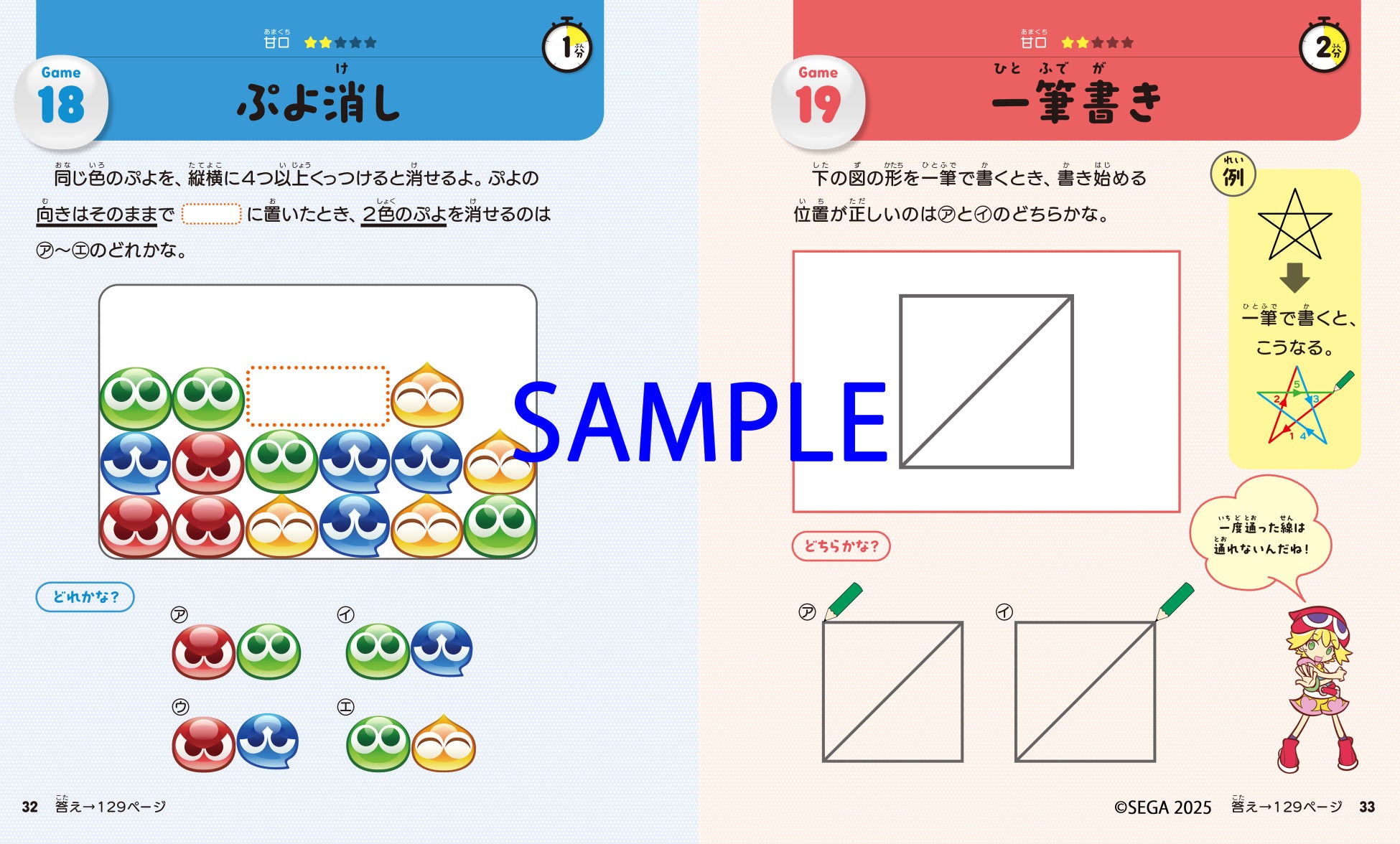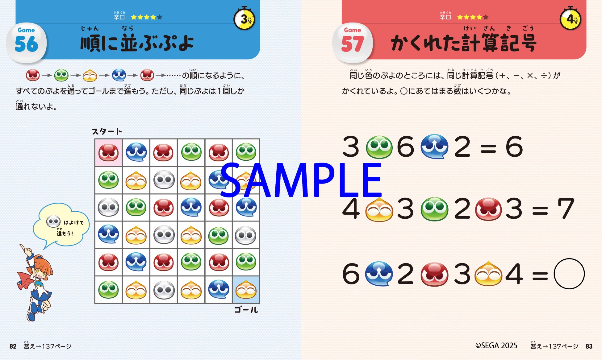 本書は、落ち物パズルゲーム「ぷよぷよ」が持つ「先を読む戦略性」や「連鎖をつなげる発想力」に着目。迷路やパズル、図形問題、ルール発見問題などを解きながら、遊び感覚で「論理的に考える力」や「問題解決力」を自然と身につけられる構成になっています。
