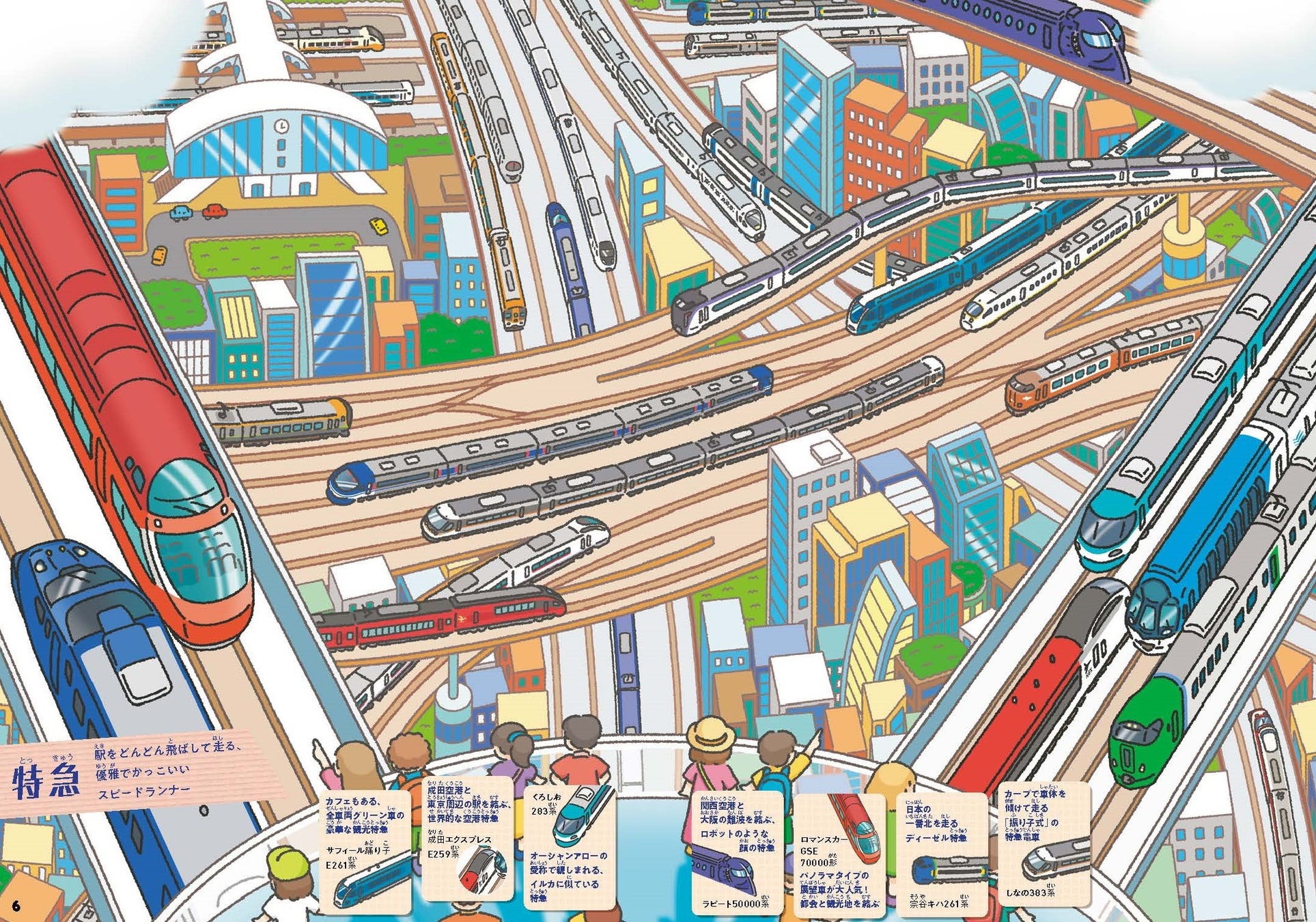 新幹線/特急/通勤電車/四季と列車/いろんな高さを走る列車/寝台列車/貨物列車/昔なつかしい列車/観光列車/未来の列車……など100種以上の列車を収録