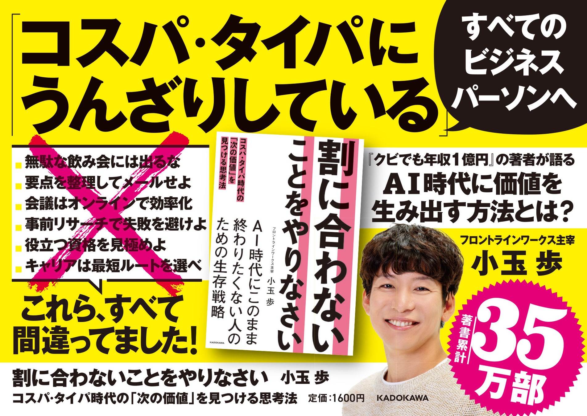 株式会社KADOKAWA(本社:東京都千代田区、取締役 代表執行役社長 CEO:夏野剛)は、2025年10月2日(木)に、ベストセラー「クビでも年収1億円」シリーズの著者でもある小玉歩氏の11年ぶりの新刊『割に合わないことをやりなさい コスパ・タイパ時代の「次の価値」を見つける思考法』を刊行しました。