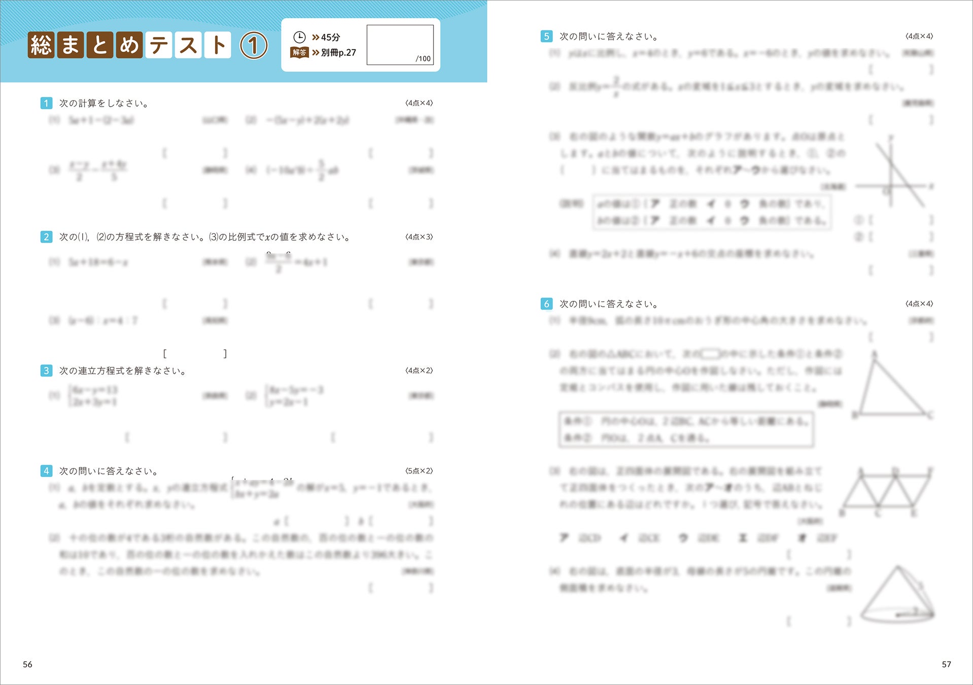 本書は、英語・数学のいずれも、入試問題からなる「総まとめテスト」全2回がついています。本書で学んだ中1・2範囲の知識がしっかり定着しているか、この2回のテストを通じて確かめましょう。