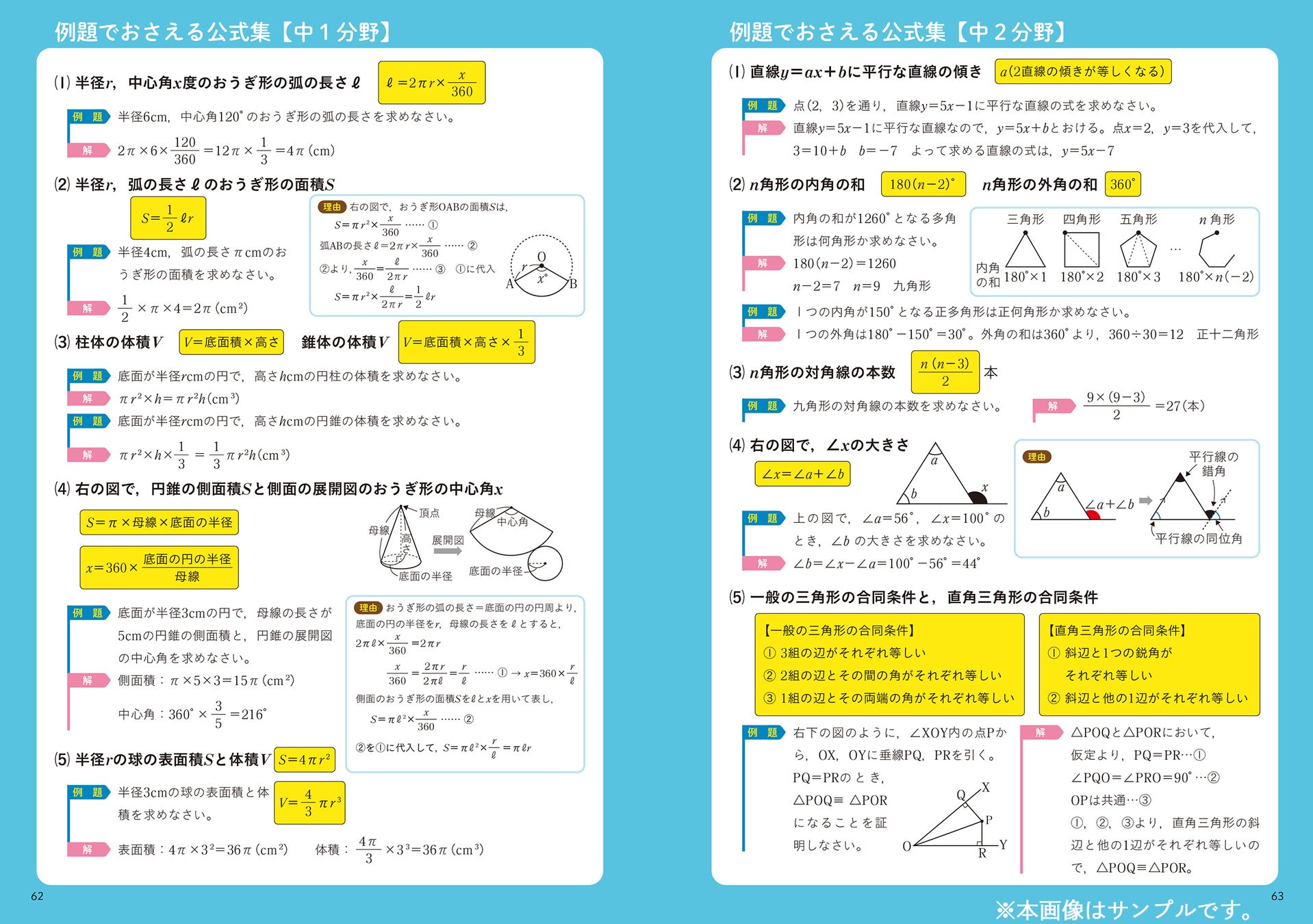 数学では、中1・2範囲で特に重要な公式を例題とセットで覚えられるよう、巻末に「例題でおさえる公式集」を収録。単に公式を確認できるだけでなく、公式が成り立つ背景も説明しているため、数学をより体系的にとらえることができます。