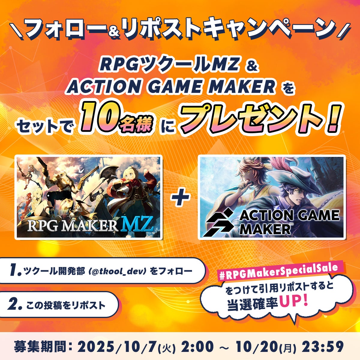 RPG Maker Special Saleの開催を記念して、「RPGツクールMZ」と「ACTION GAME MAKER」をセットで10名様にプレゼントする、リポストキャンペーンを実施します。