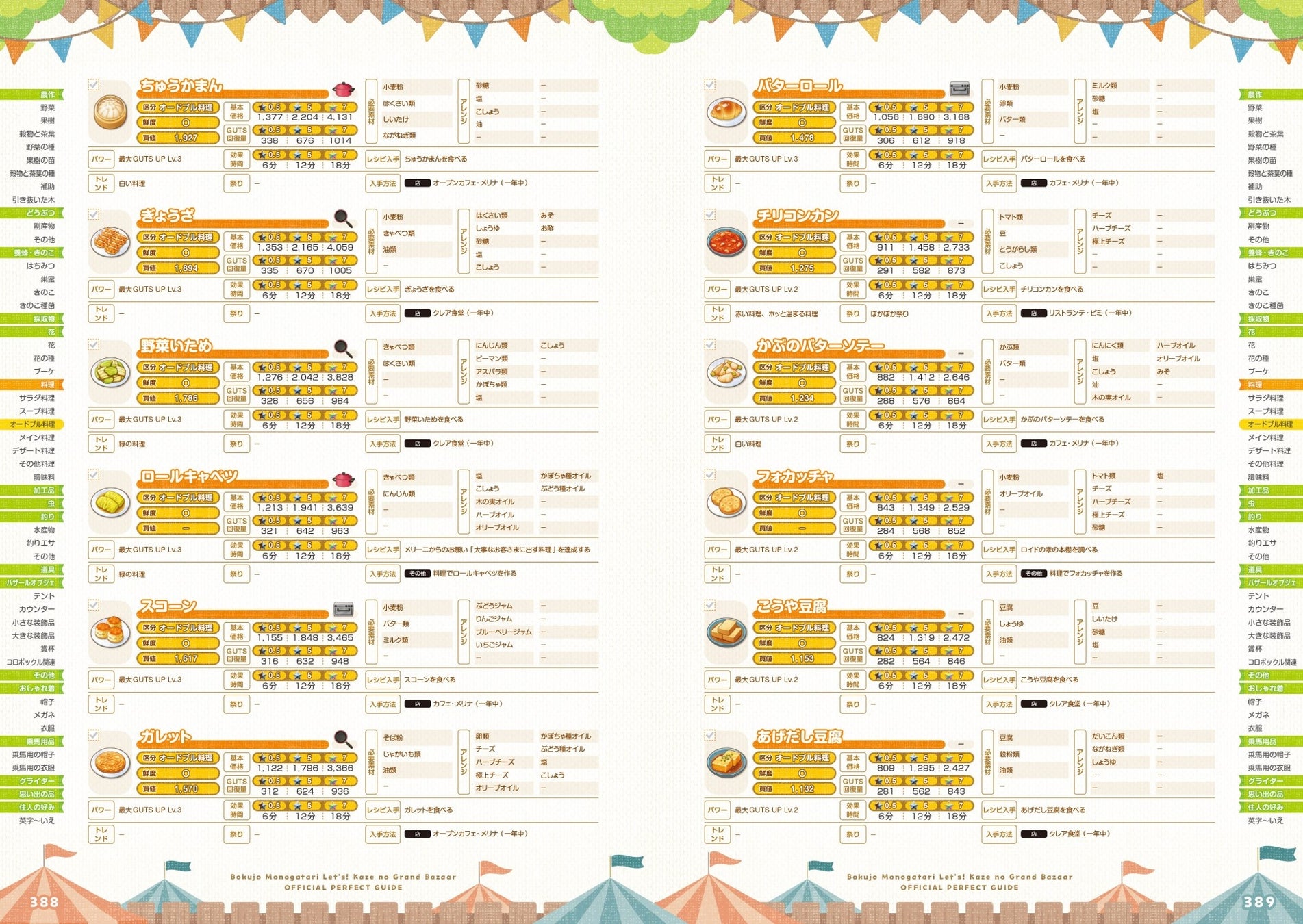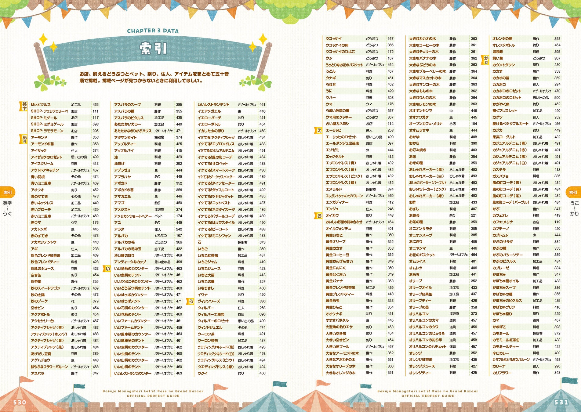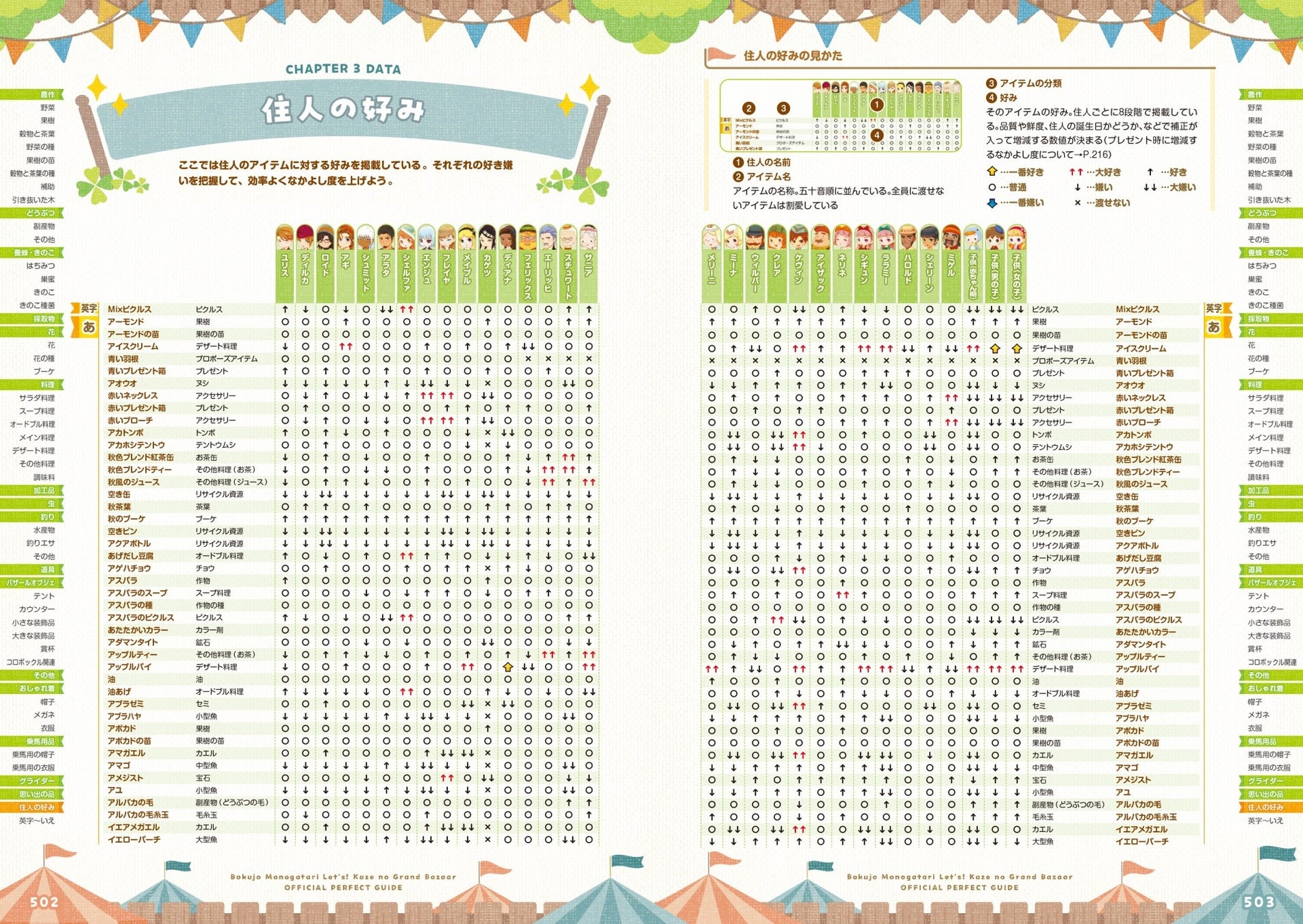 膨大なデータを完全収録。リストが見やすく、料理のレシピのように情報量が多いデータを閲覧・利用しやすくなるよう配慮しました。全住人の好みを一覧化した巨大表組は必見です!