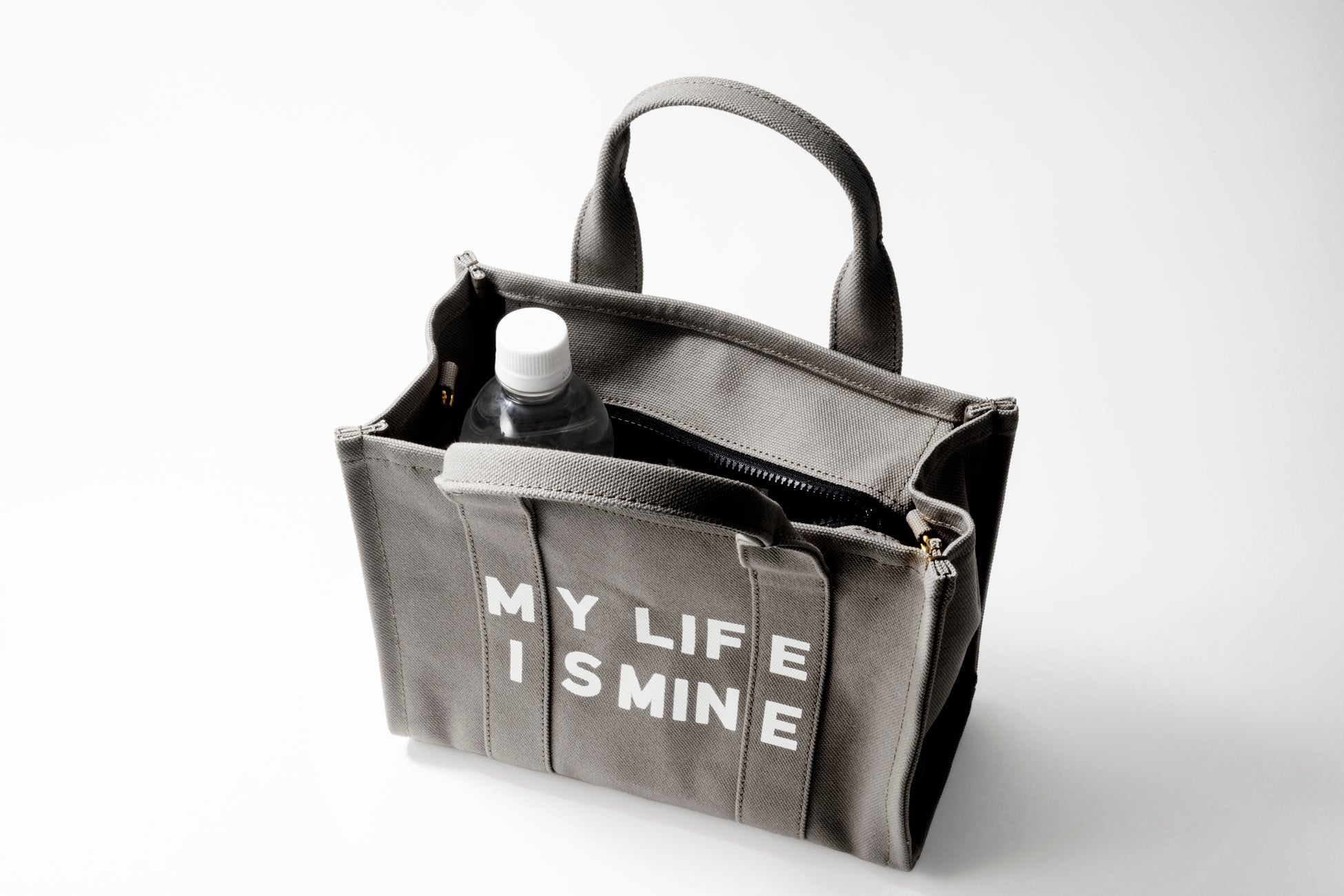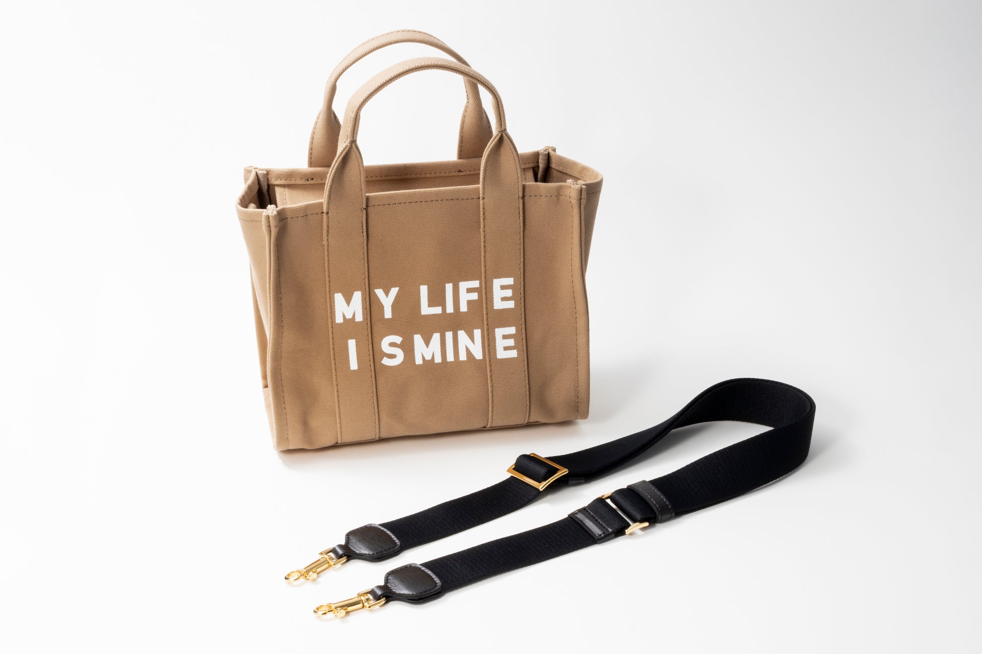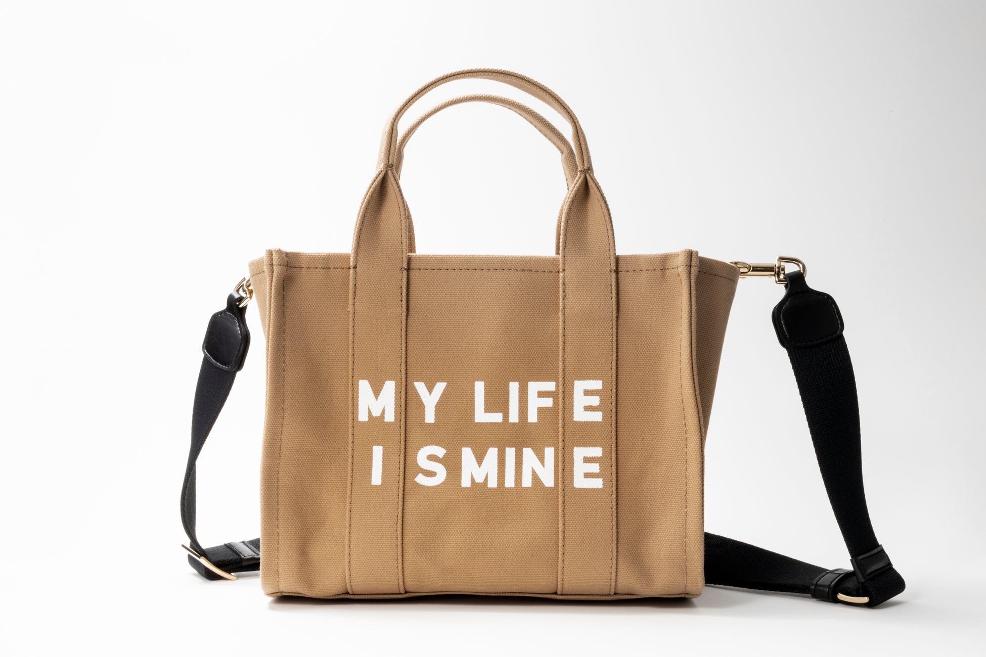 「私の人生は私のもの」を意味する“MY LIFE IS MINE”のスローガンを大胆にプリントし、持つ人の背中をそっと押してくれるようなデザインに仕上げました。
