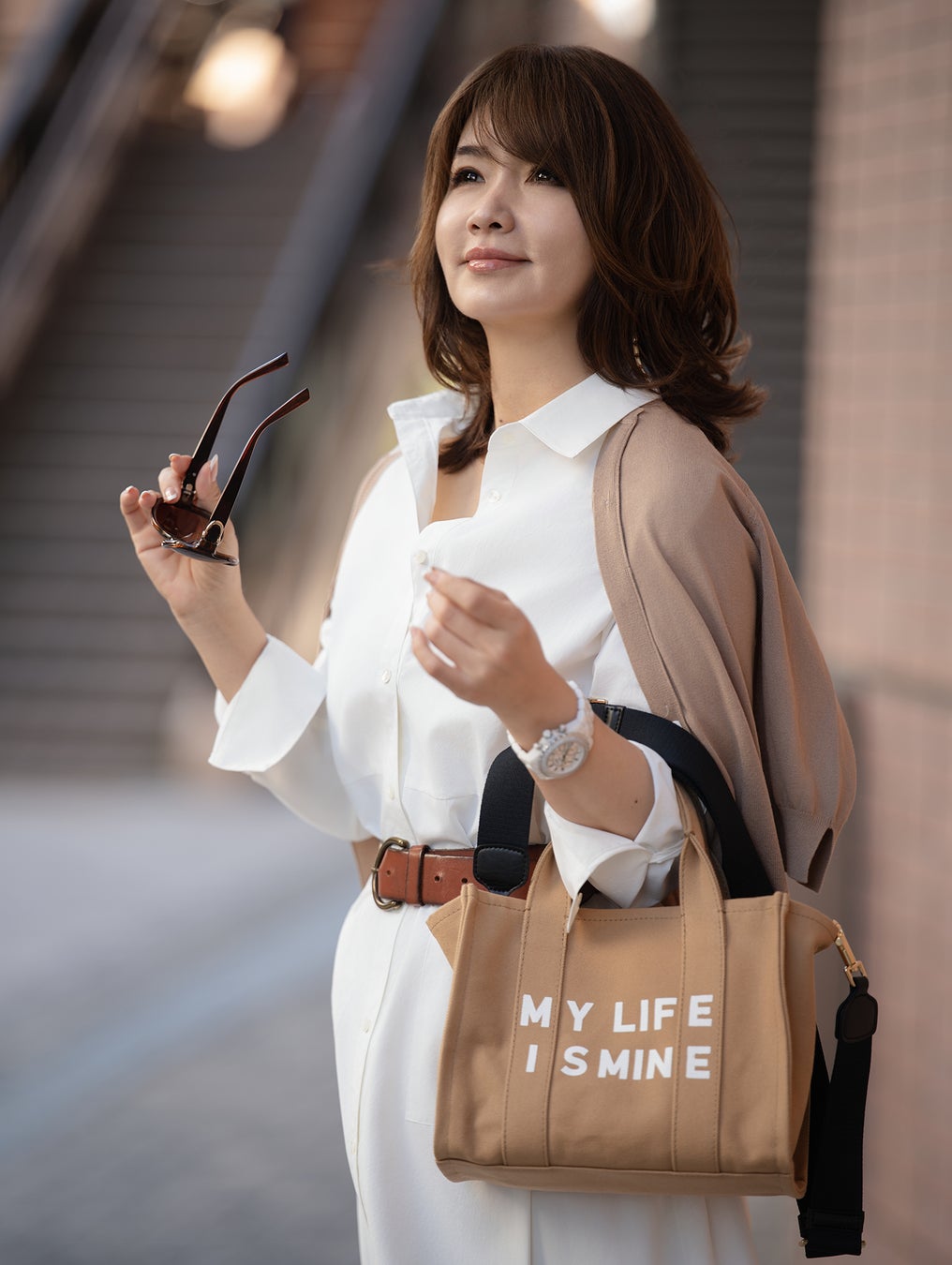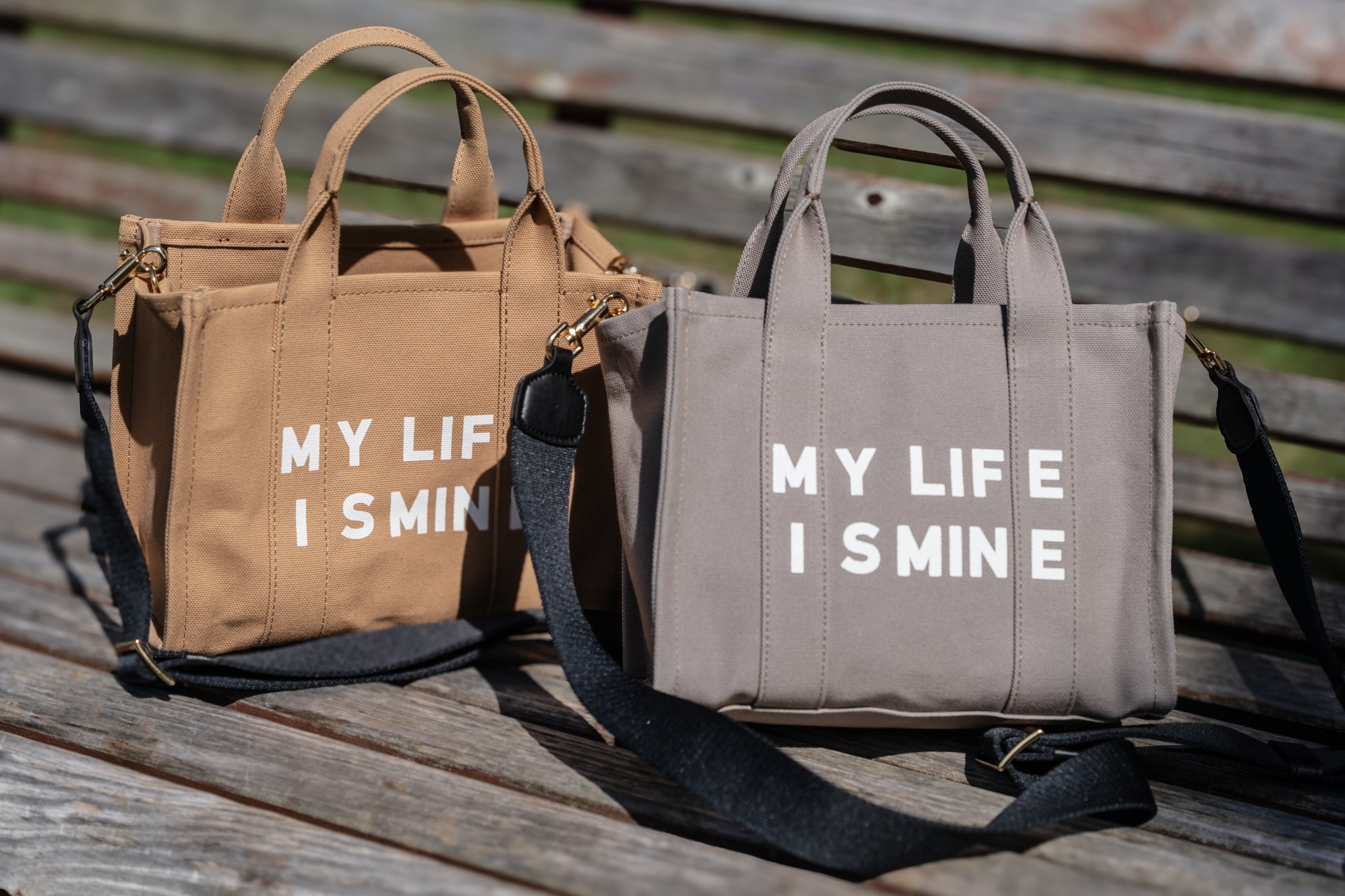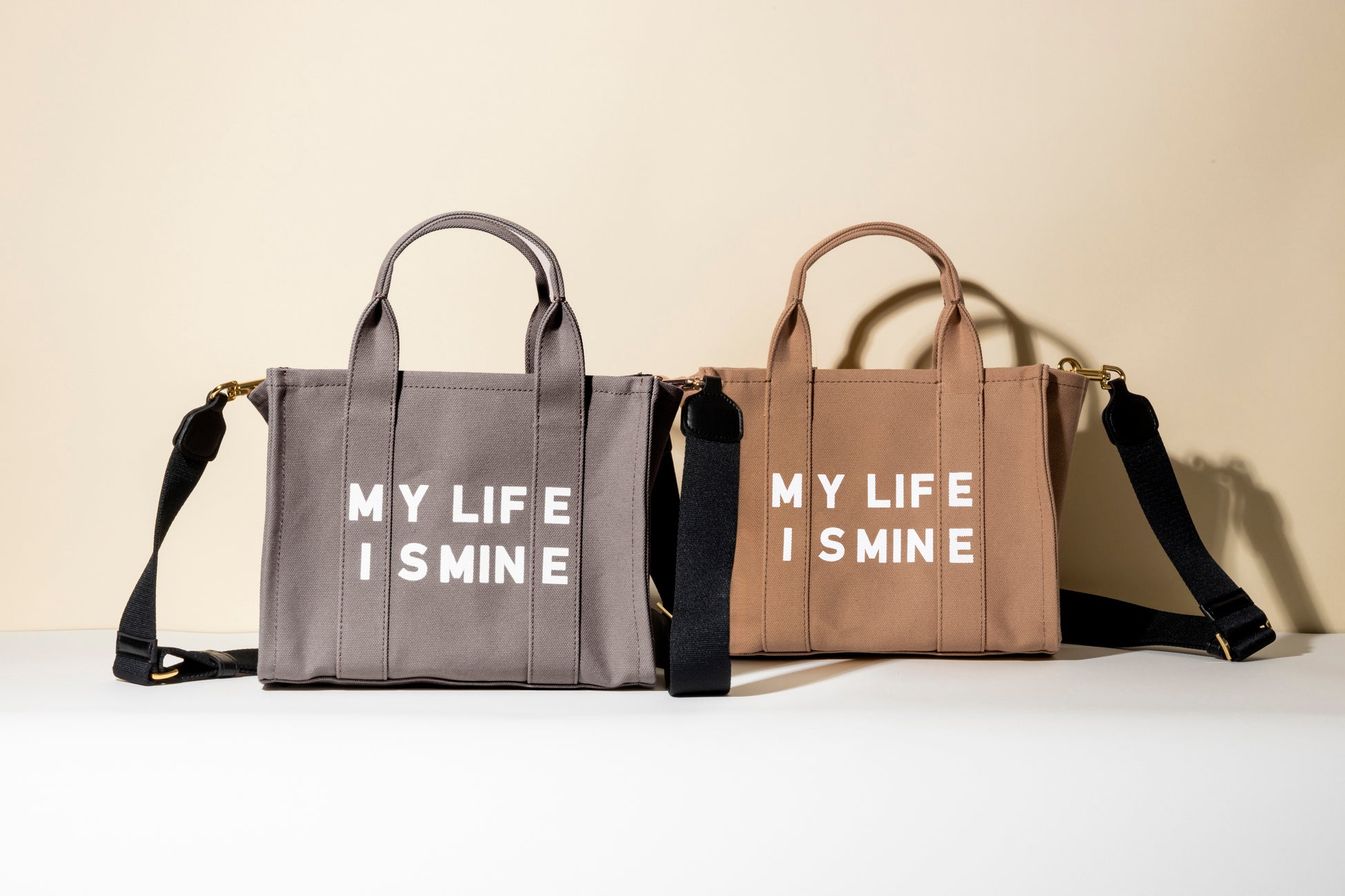 「私の人生は私のもの」を意味する“MY LIFE IS MINE”のスローガンを大胆にプリントし、持つ人の背中をそっと押してくれるようなデザインに仕上げました。